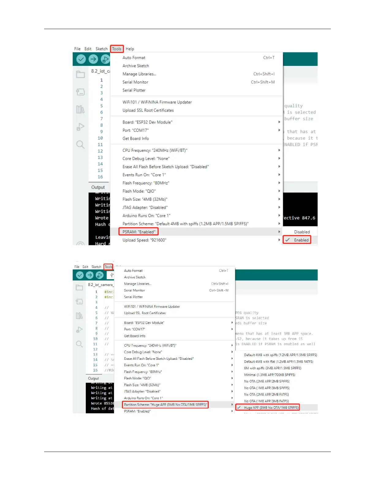 7. Set the partition scheme to Huge APP (3MB No OTA/1MB SPIFFS).