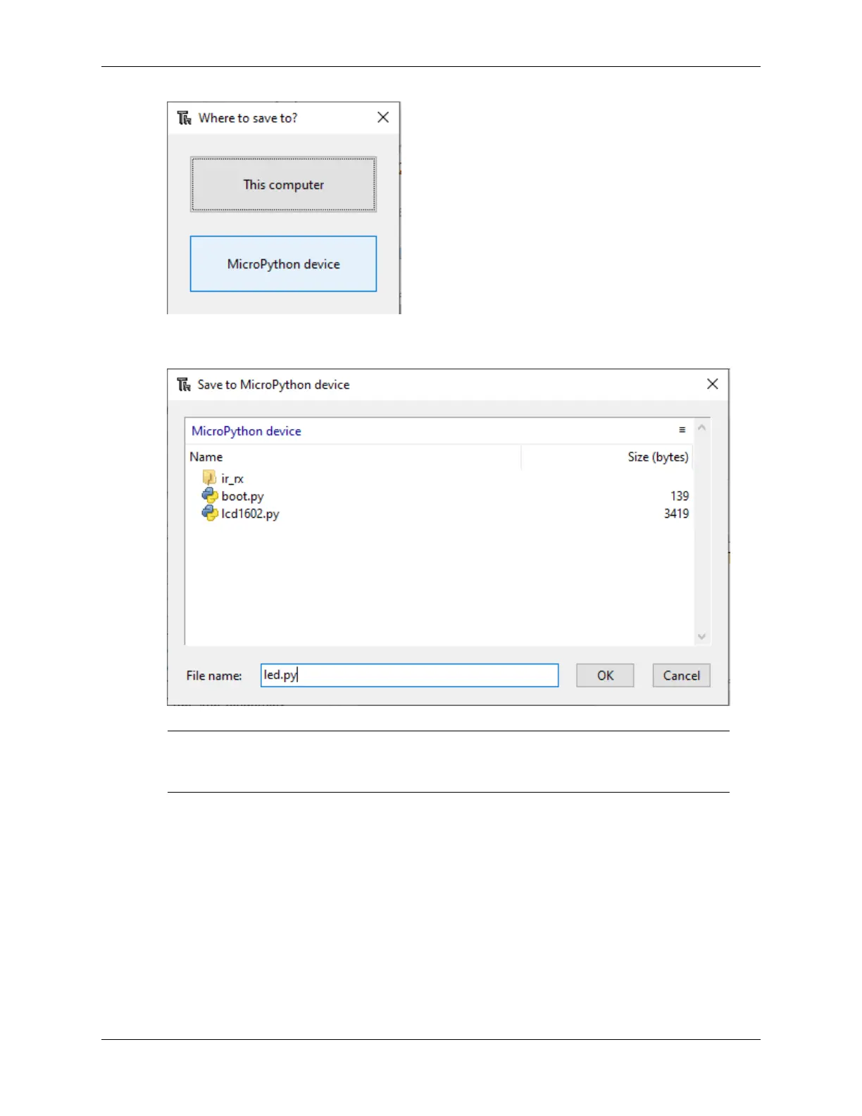 Then click OK after entering the file name and extension .py. On the MicroPython drive, you will