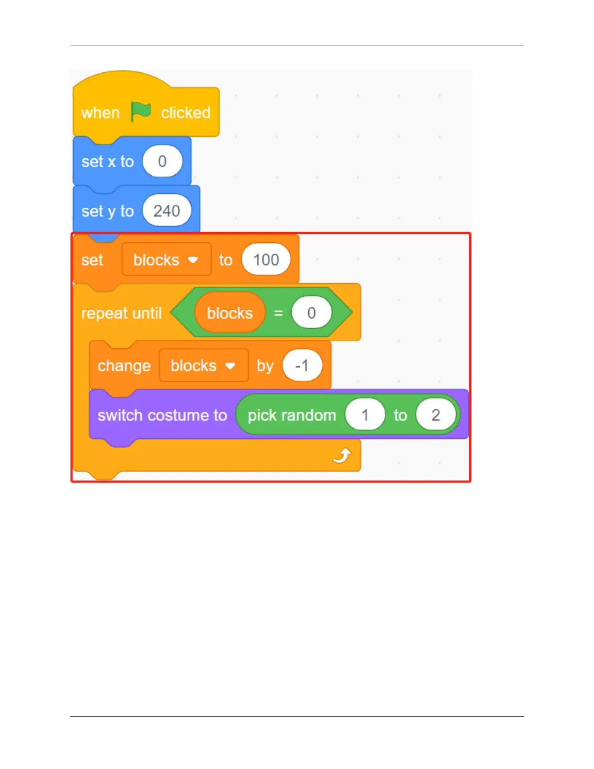 is 0. Two [wait () seconds] blocks are used here, the first to limit the interval between Tile’s clones and the second is to