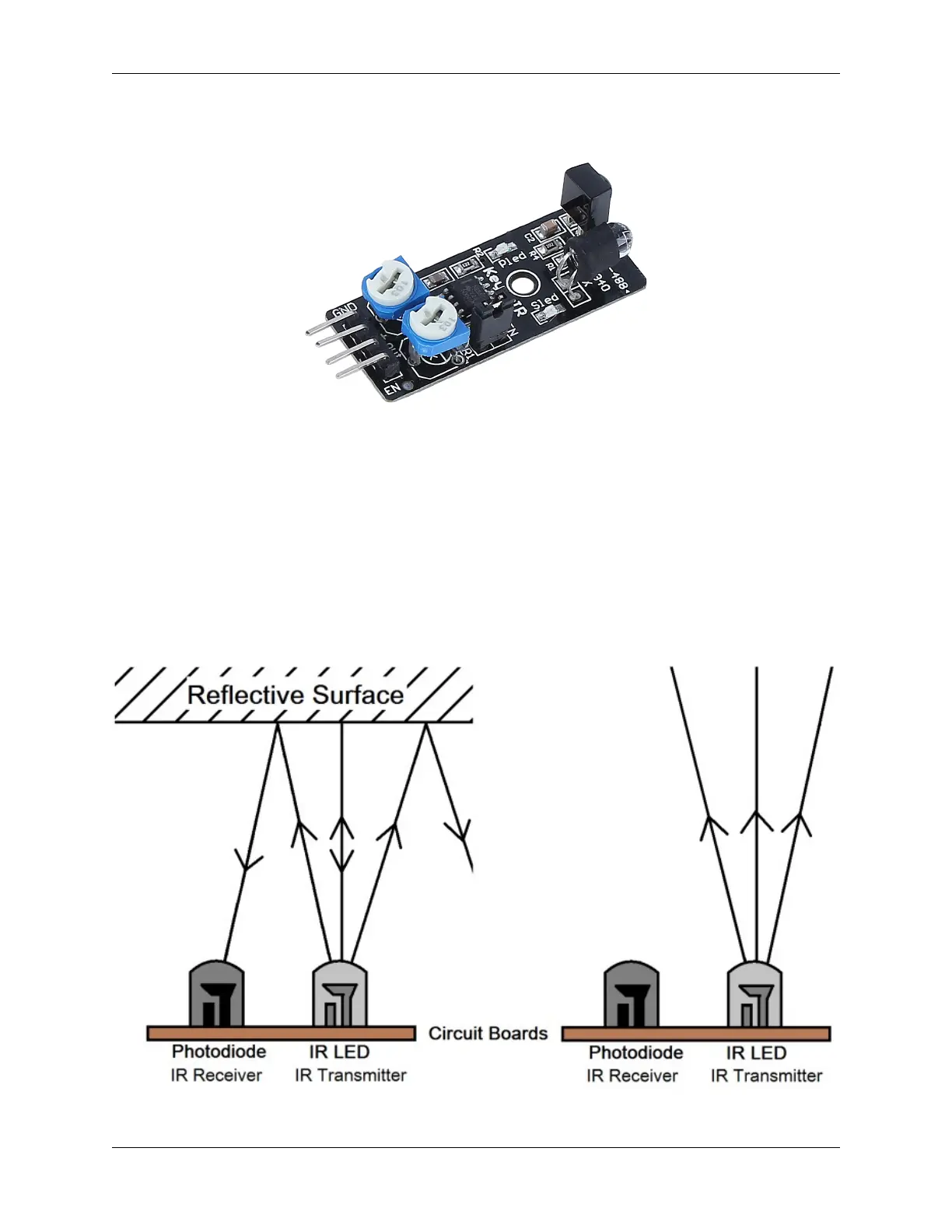 and a receiver. The transmitter is like the module’s flashlight, emitting infrared light. When an obstacle appears, the