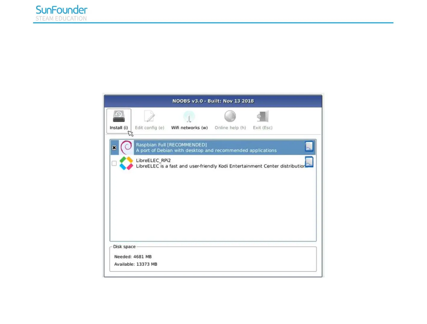 networks (w) first. Tick the checkbox of the Raspbian and click Install in the top left corner. The NOOBS will