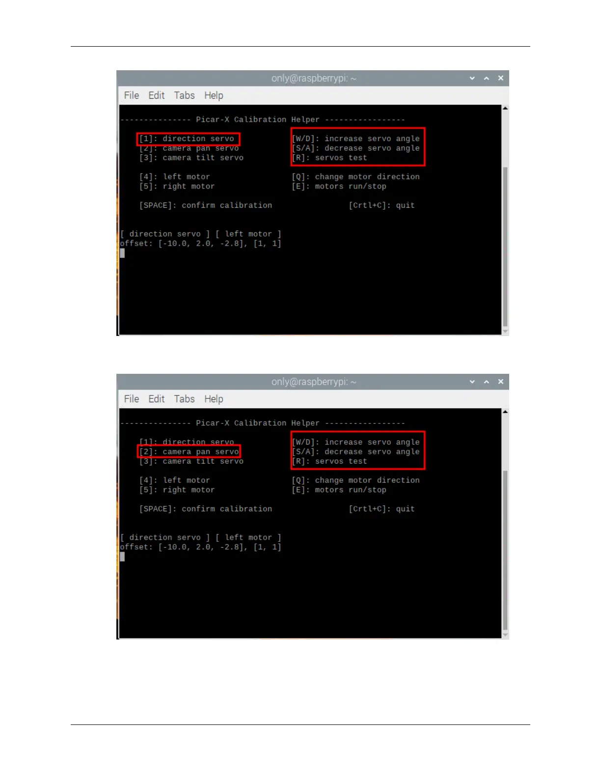 5. Press the number key 2 to select the Pan servo, then press the W/S key to make the pan/tilt platform look straight