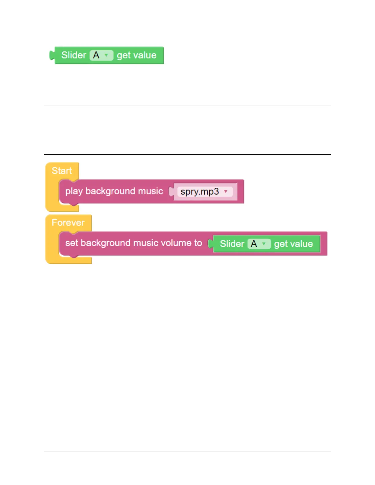 The slider [A] get value block will read the slider value. The example above has slider ‘A’ selected. If there are