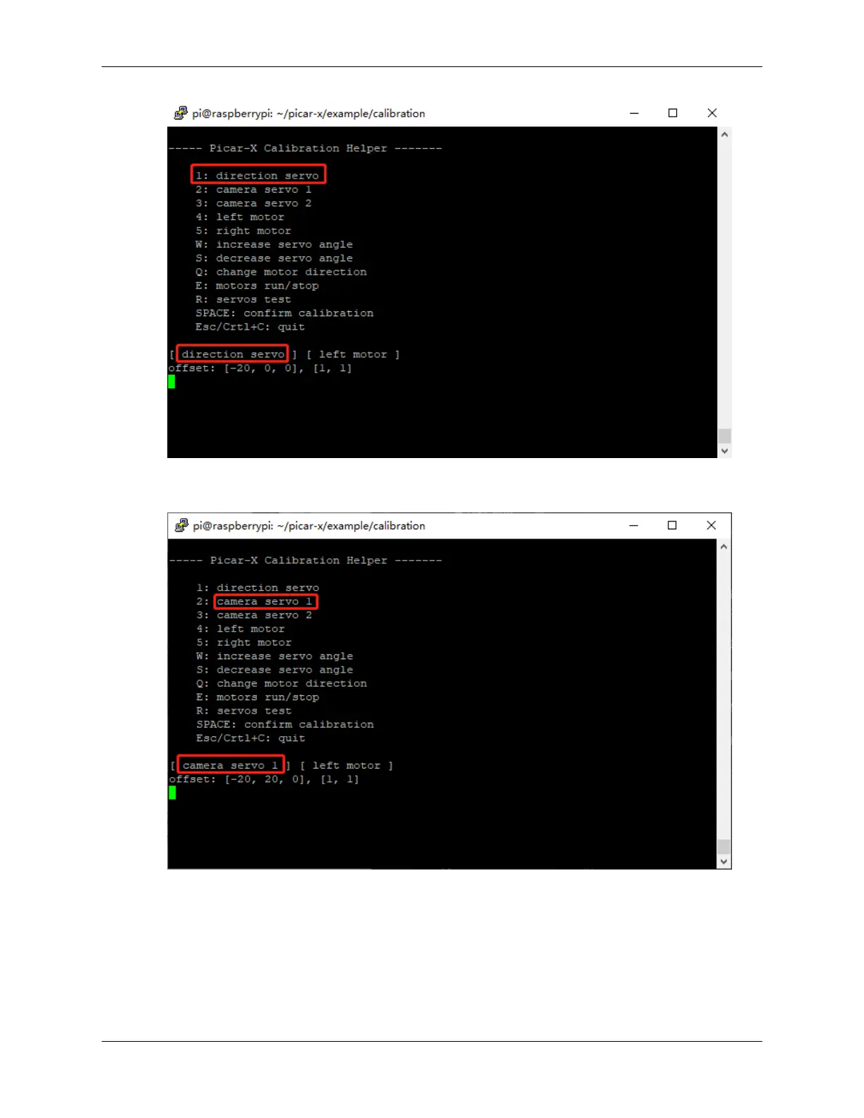 5. Press the number key 2 to select the Pan servo, then press the W/S key to make the pan/tilt platform look