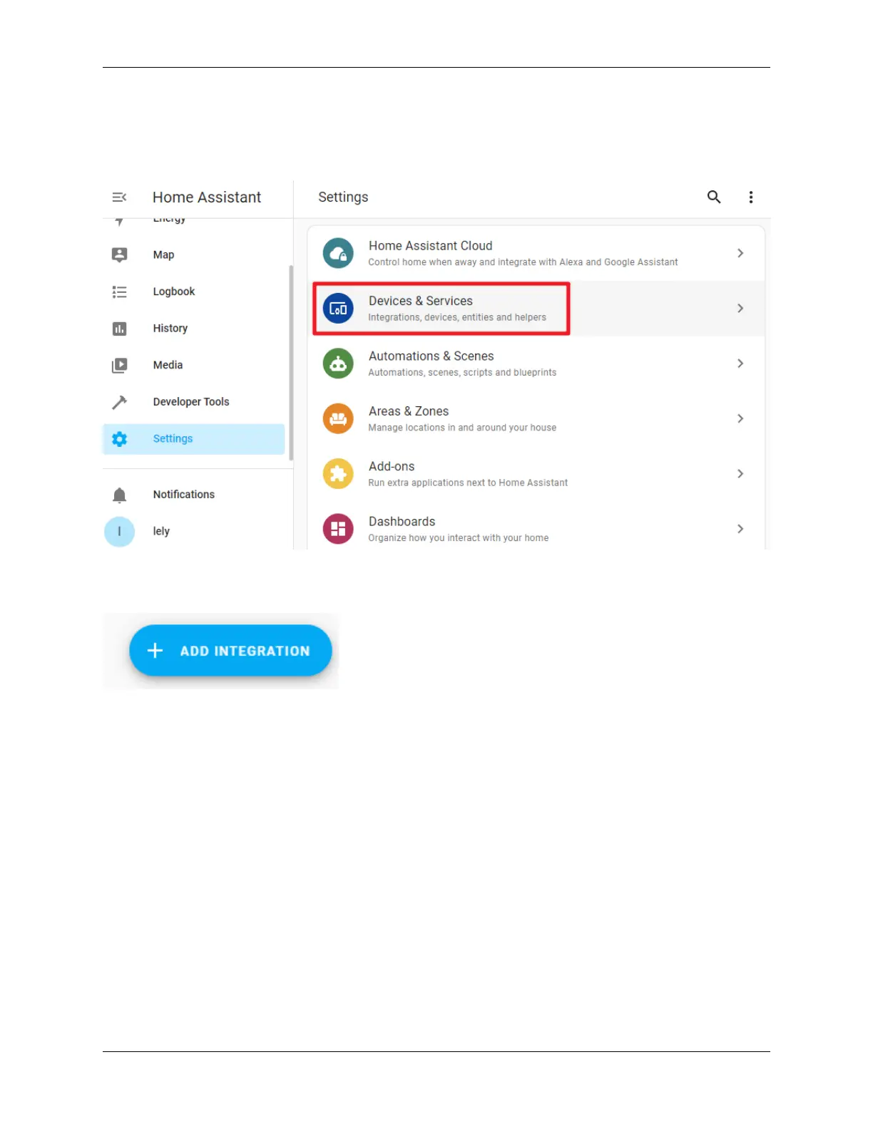 Open your Home Assistant page, select Configuration from the left sidebar, then select Devices and Services.