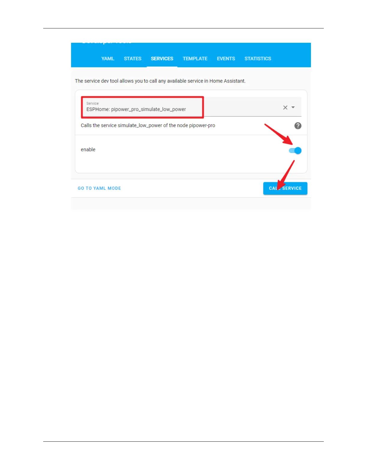 3. In the list of services, choose ESPHome: pipower_pro_enable_coulomb_count_beta.