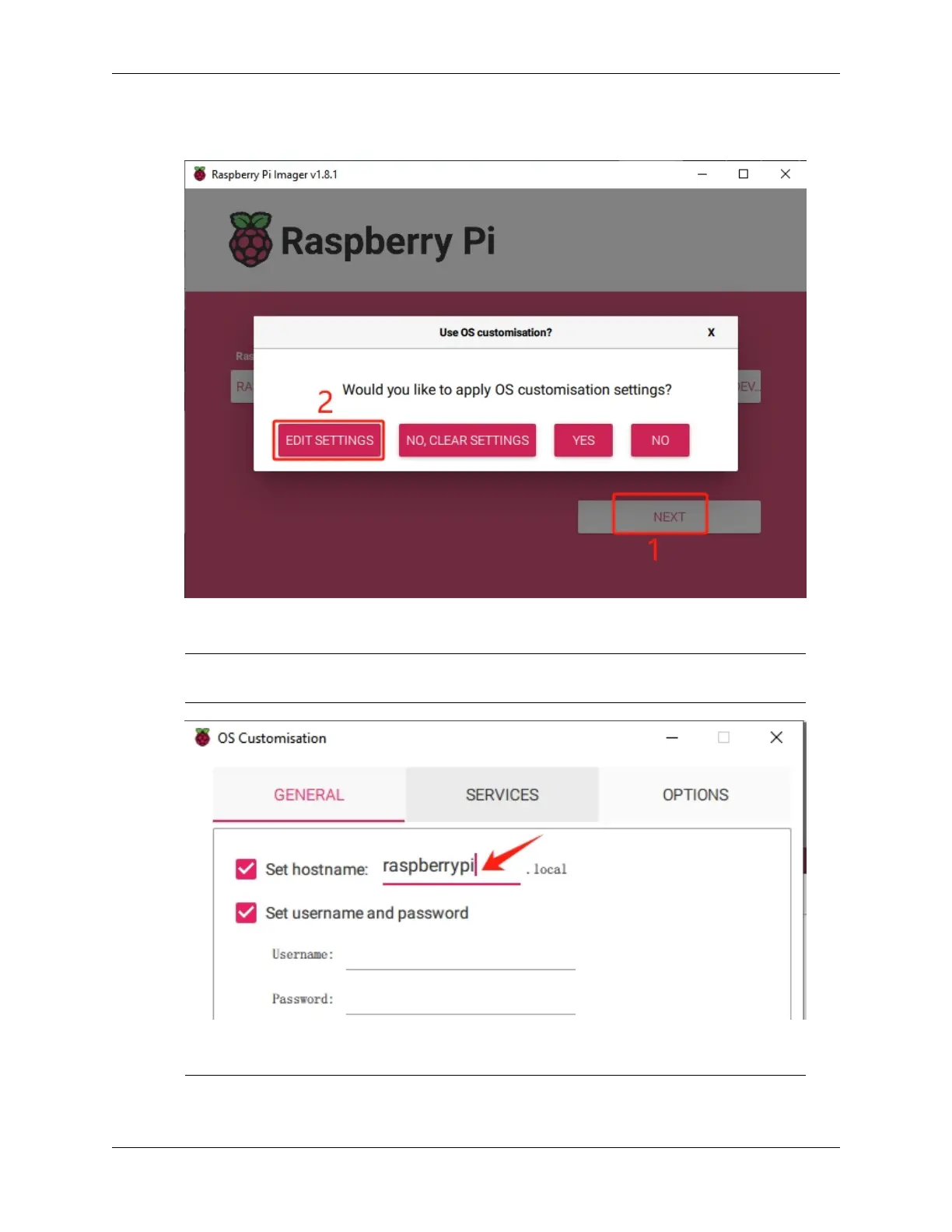 8. Click NEXT and then EDIT SETTINGS to tailor your OS settings. If you have a monitor for your Raspberry
