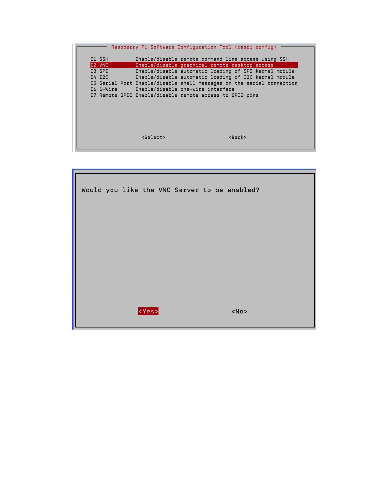 4. Use the arrow keys to choose <Yes> -> <OK> -> <Finish> and finalize the VNC service activation.