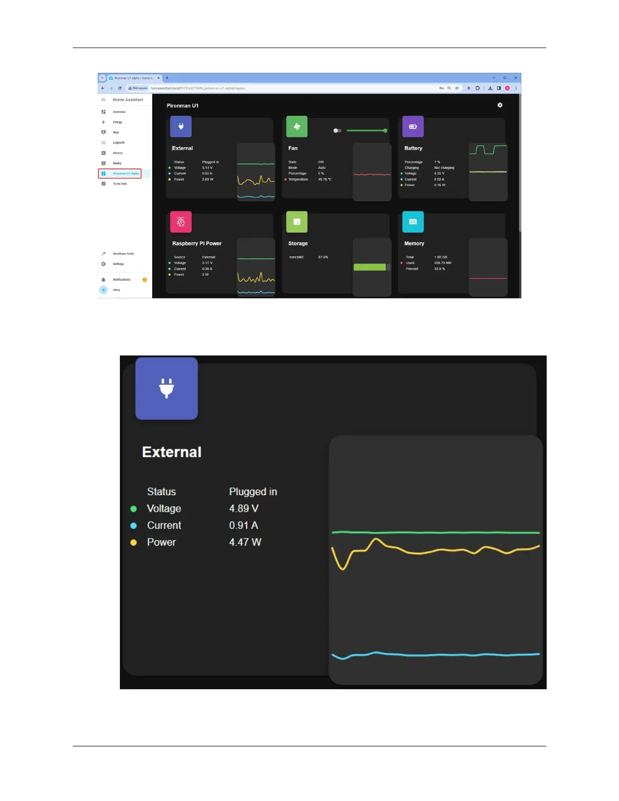 – External: Displays the status of the external USB power (Plugged in or Unplugged), its voltage, current,