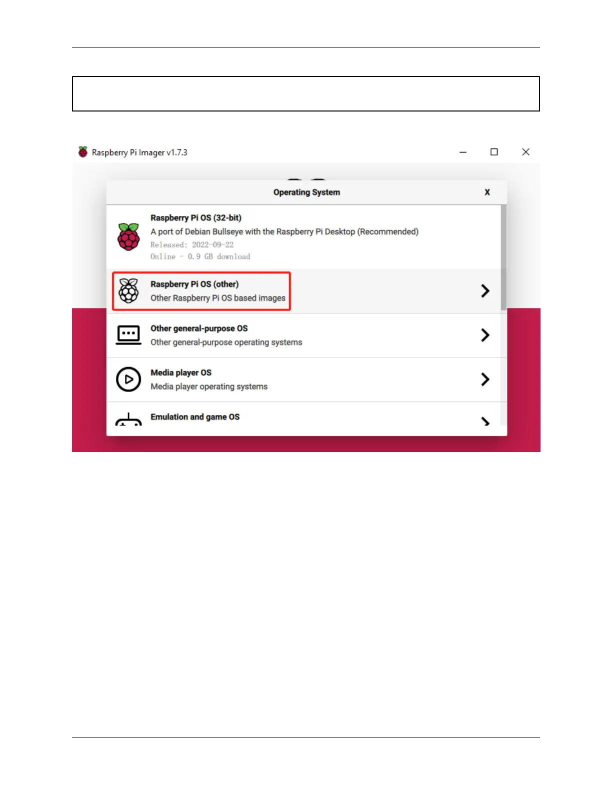 In the Raspberry Pi Imager, click CHOOSE OS -> Raspberry Pi OS(other).