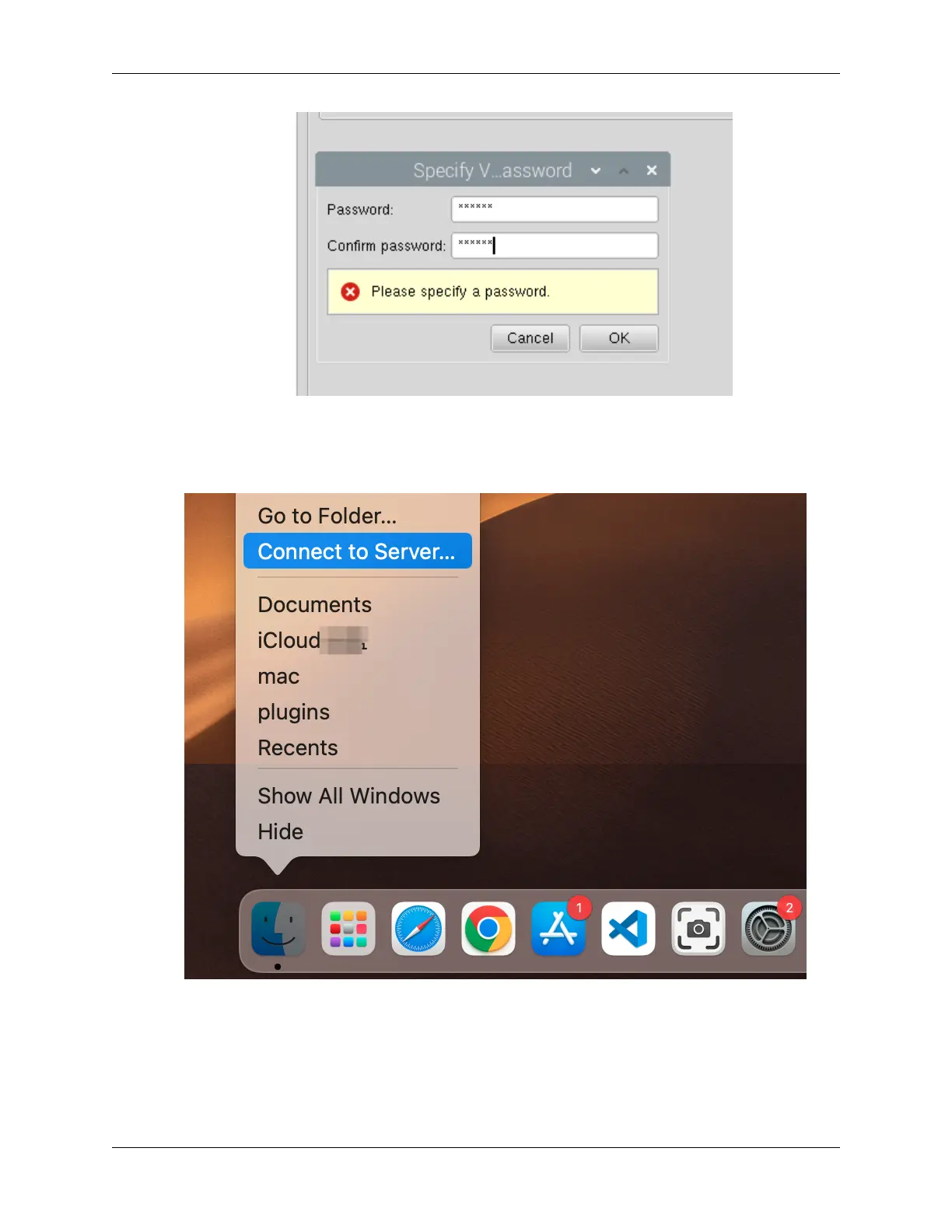 2. Type in vnc://<username>@<hostname>.local (or vnc://<username>@<IP address>). Af-