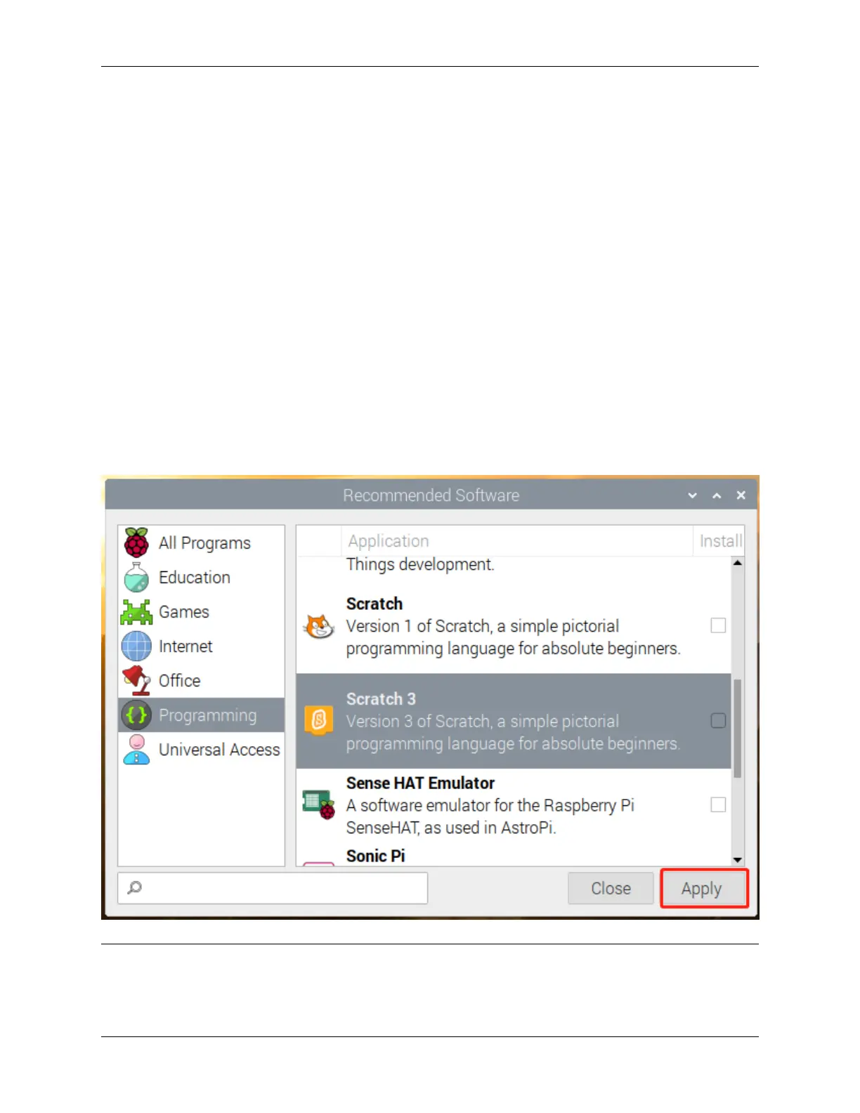 If the Raspberry Pi system you downloaded comes with recommended software, you can find Scratch 3 in Program-