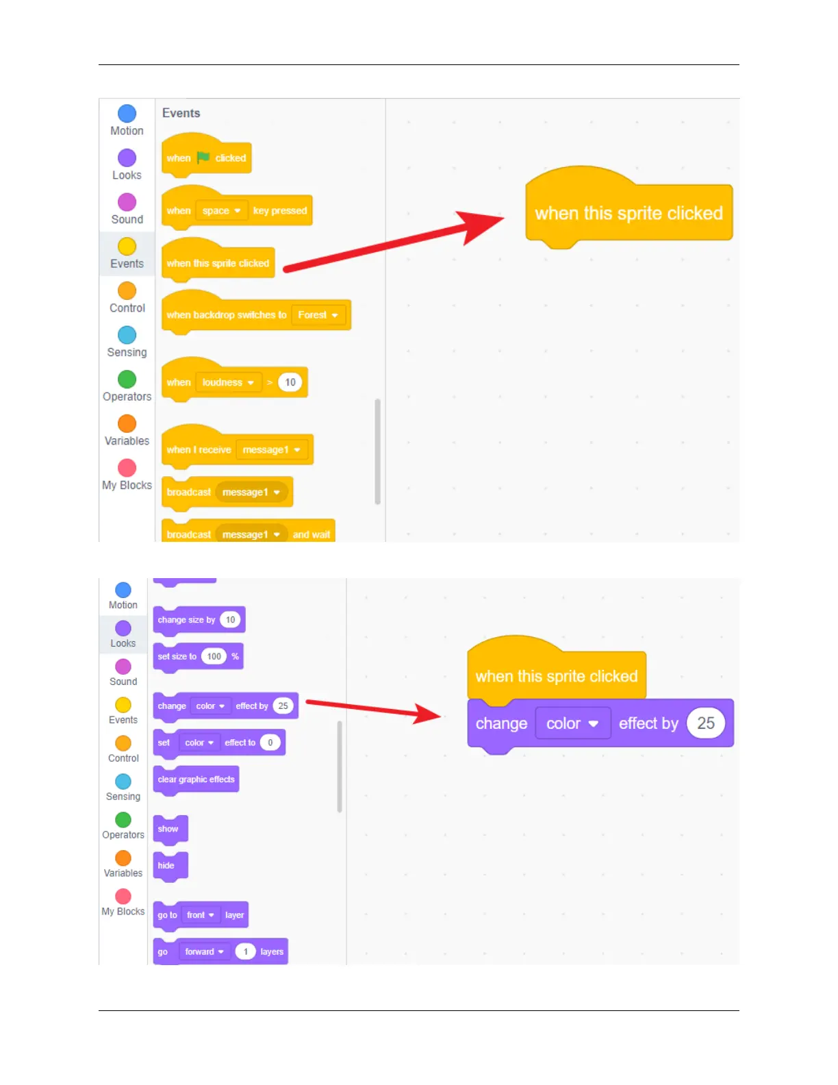 Drag change color effect by. . . from Looks to the bottom of when this sprite cliked.