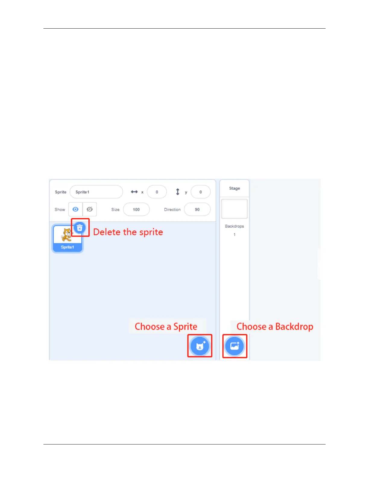 In the lower right corner of the Scratch, there are two areas-the character area and the stage area, where we can add