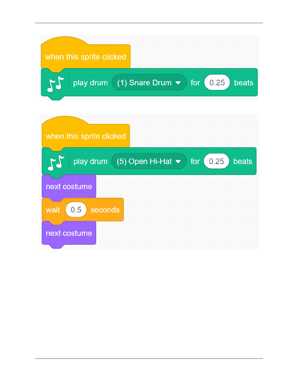 Change the option to (5) Open Hi-Hat, then use the “next costume” block to switch the appearance of Drum-highhat.