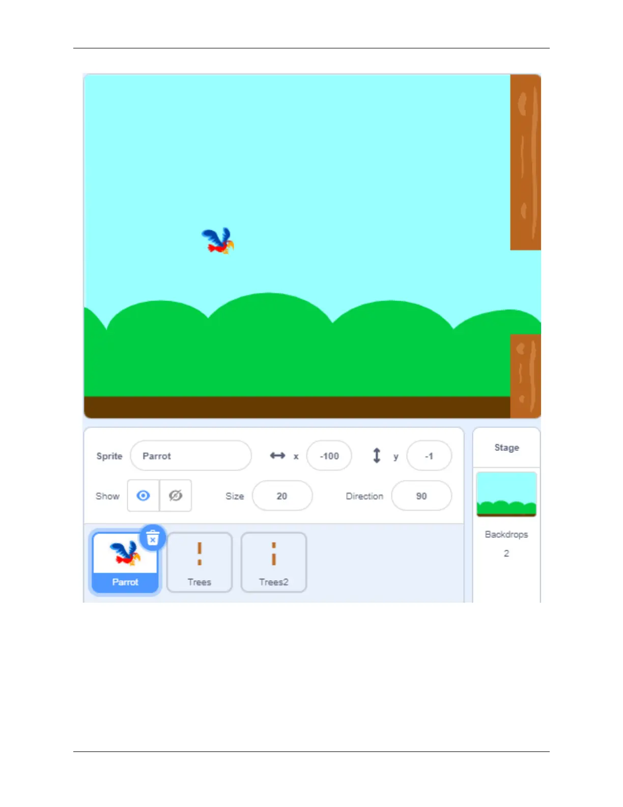 Parrot stayed still, and the Trees and Trees2 sprites kept moving to the left, so it looked like the Parrot sprites were