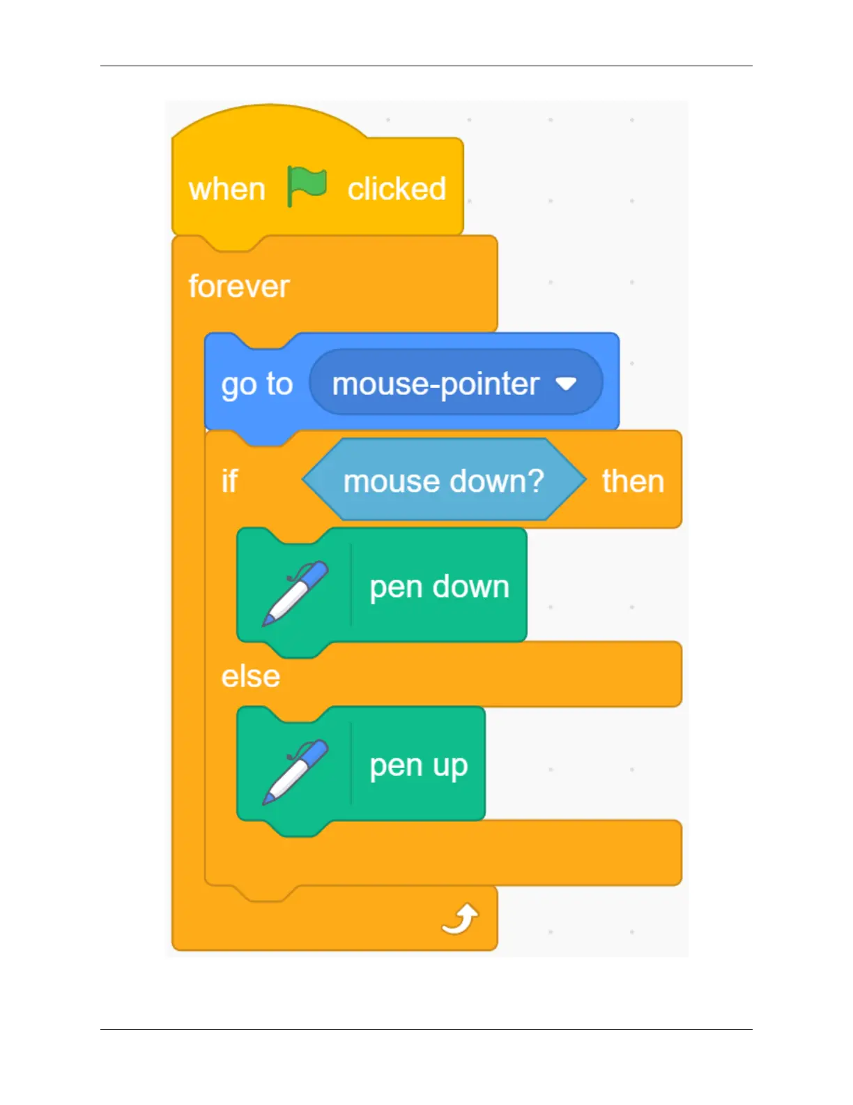 Click on the green flag and try to control the Pencil sprite with the mouse to draw a smiley face. You will find that the