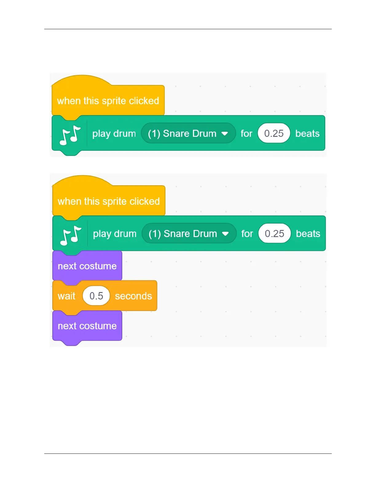Change the option to (1) Snare Drum, then use the “next costume” block to switch the appearance of Drum-snare.