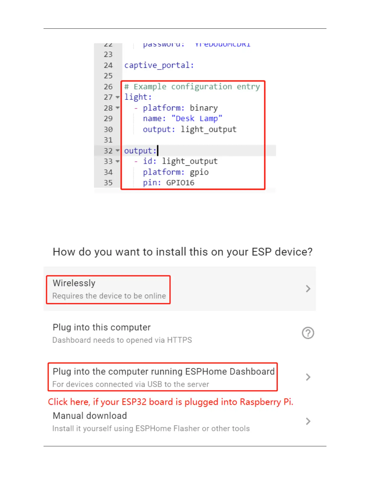 Wirelessly and USB Port. But for the first installation you need to connect the ESP32 board to the Raspberry Pi using