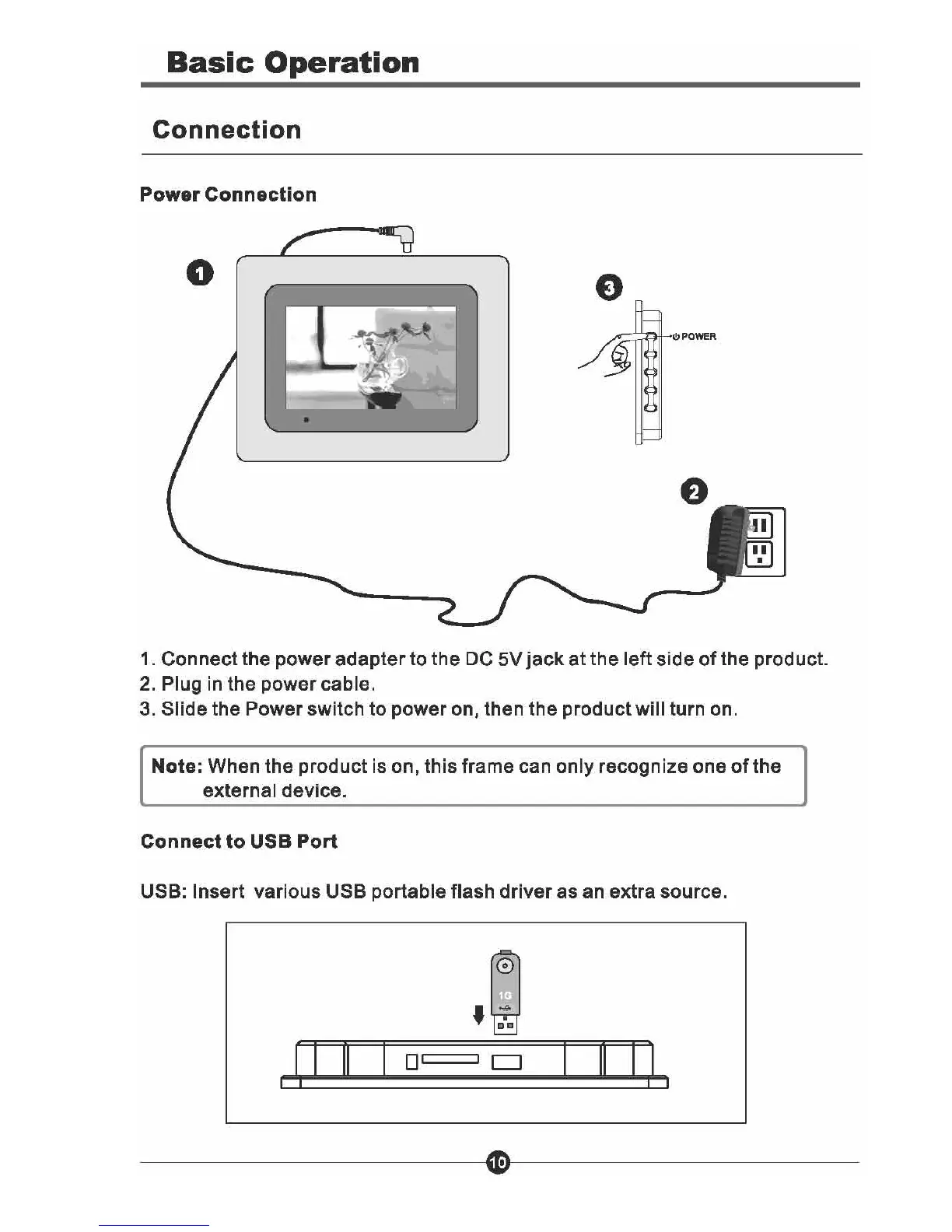 Sungale CA700 - Basic Operation; Power and USB Connection