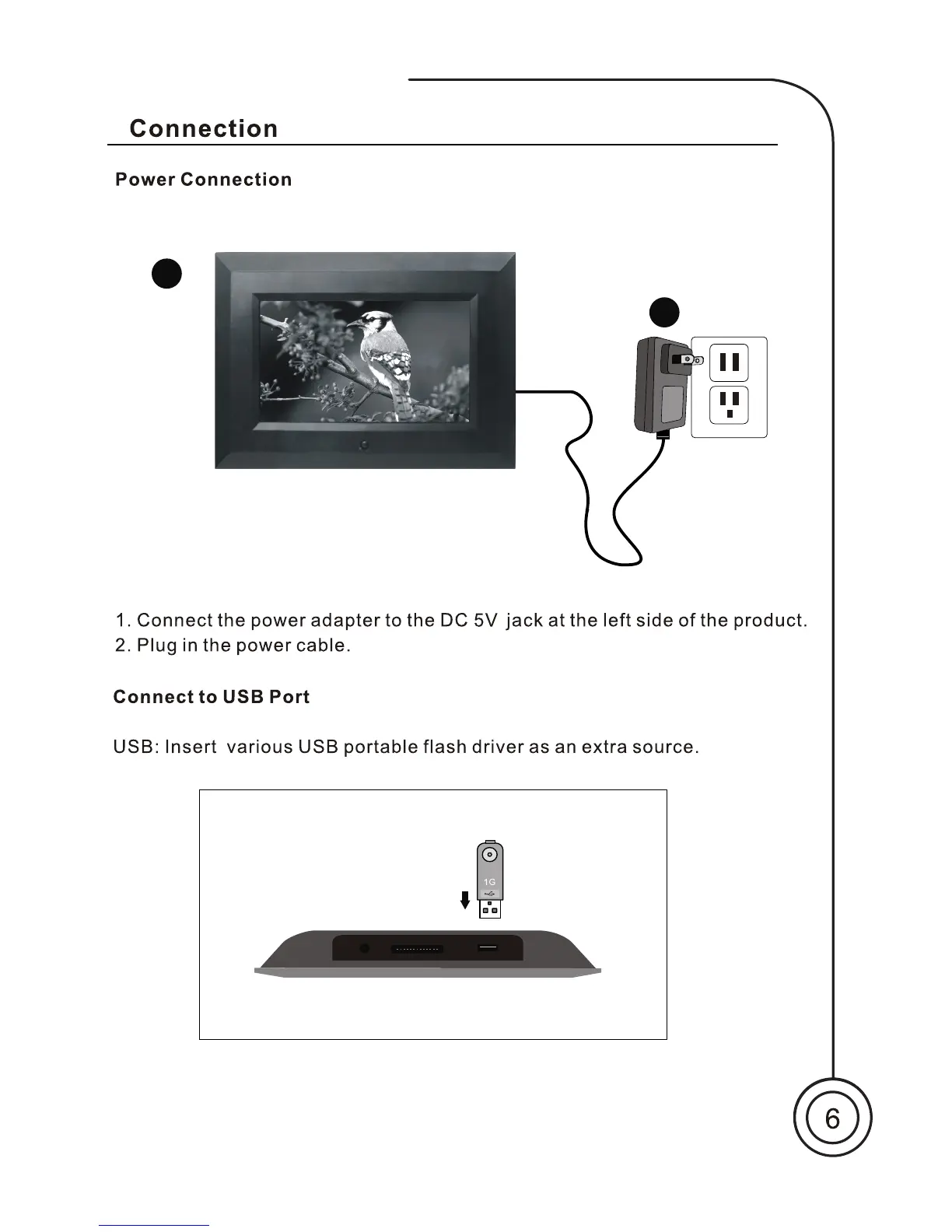 Sungale CA705 - Connection; Power Connection; Connect to USB Port