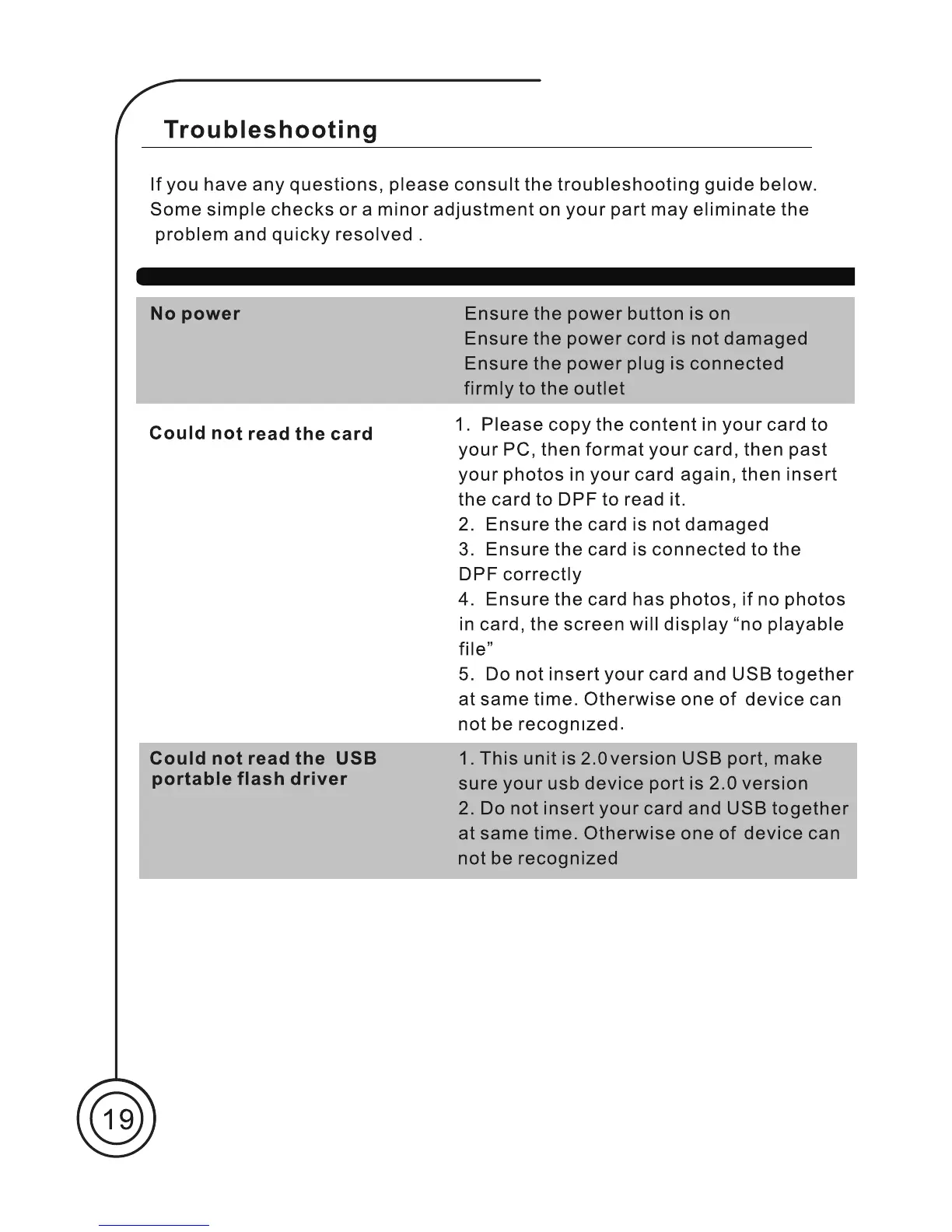 Sungale CD705 - Troubleshooting; No Power; Card Read Errors; USB Recognition Issues