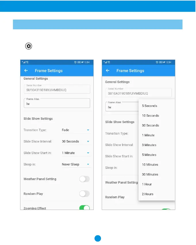 Tap icon to go to Setting menu, You can set up: General Settings, Slide show Settings,