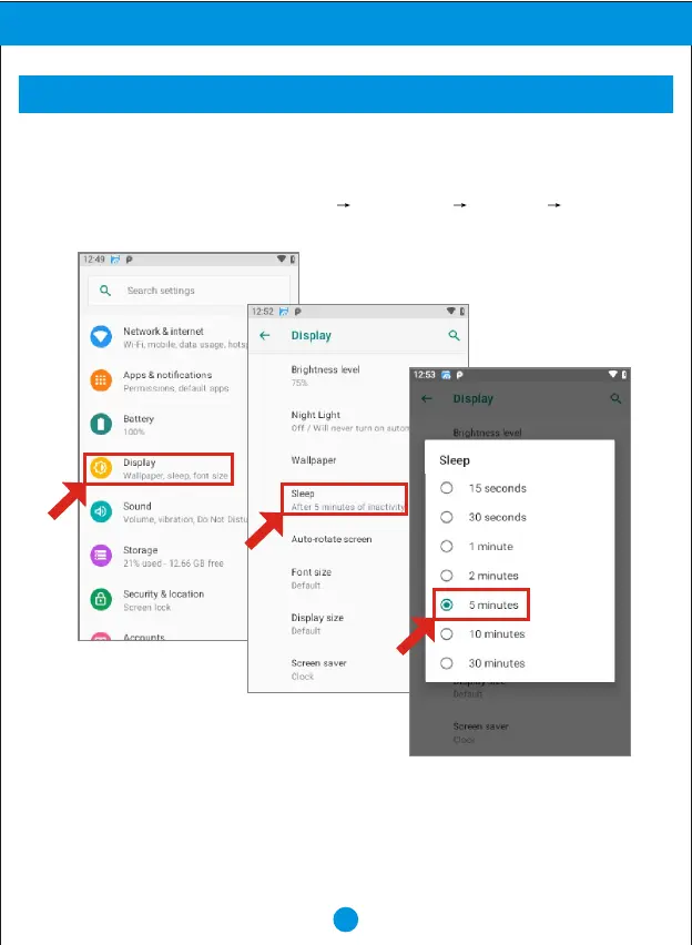 1. From Home screen, touch "SETTINGS" "SETTINGS" "Display" "Sleep".