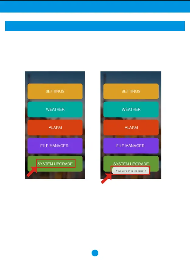 From Home screen, touch "SETTINGS", then touch "SYSTEM UPGRADE".
