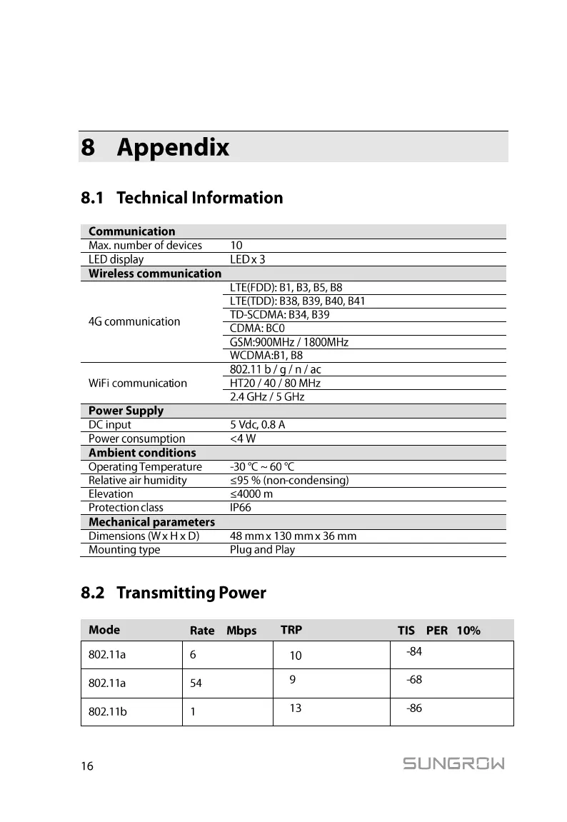 Sungrow EyeM4 - Appendix; Technical Specifications; Transmitting Power Details