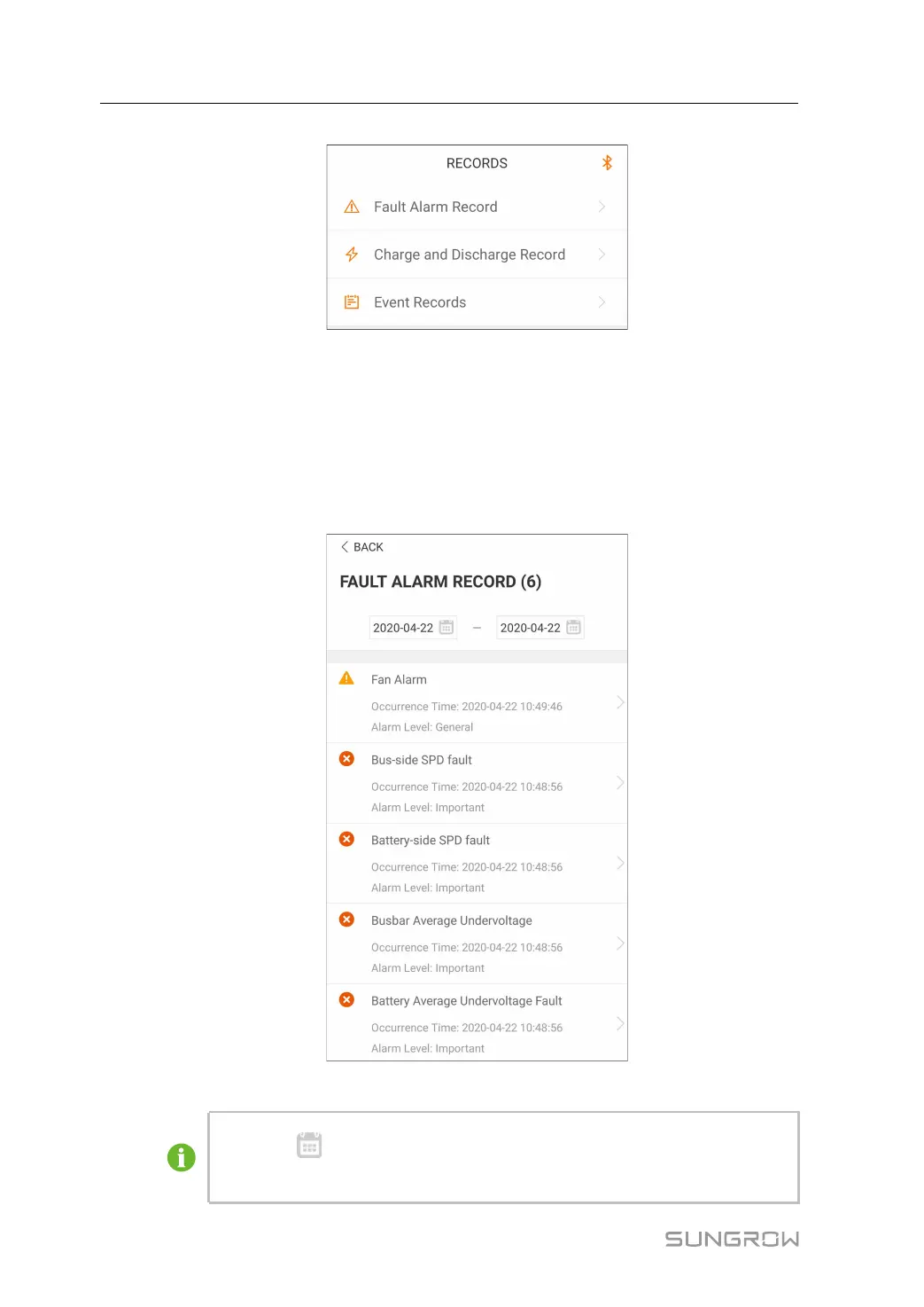 Tap“ FFaauulltt AAllaarrmm RReeccoorrddss” to view fault and alarm records, as shown in"Figure 7-6