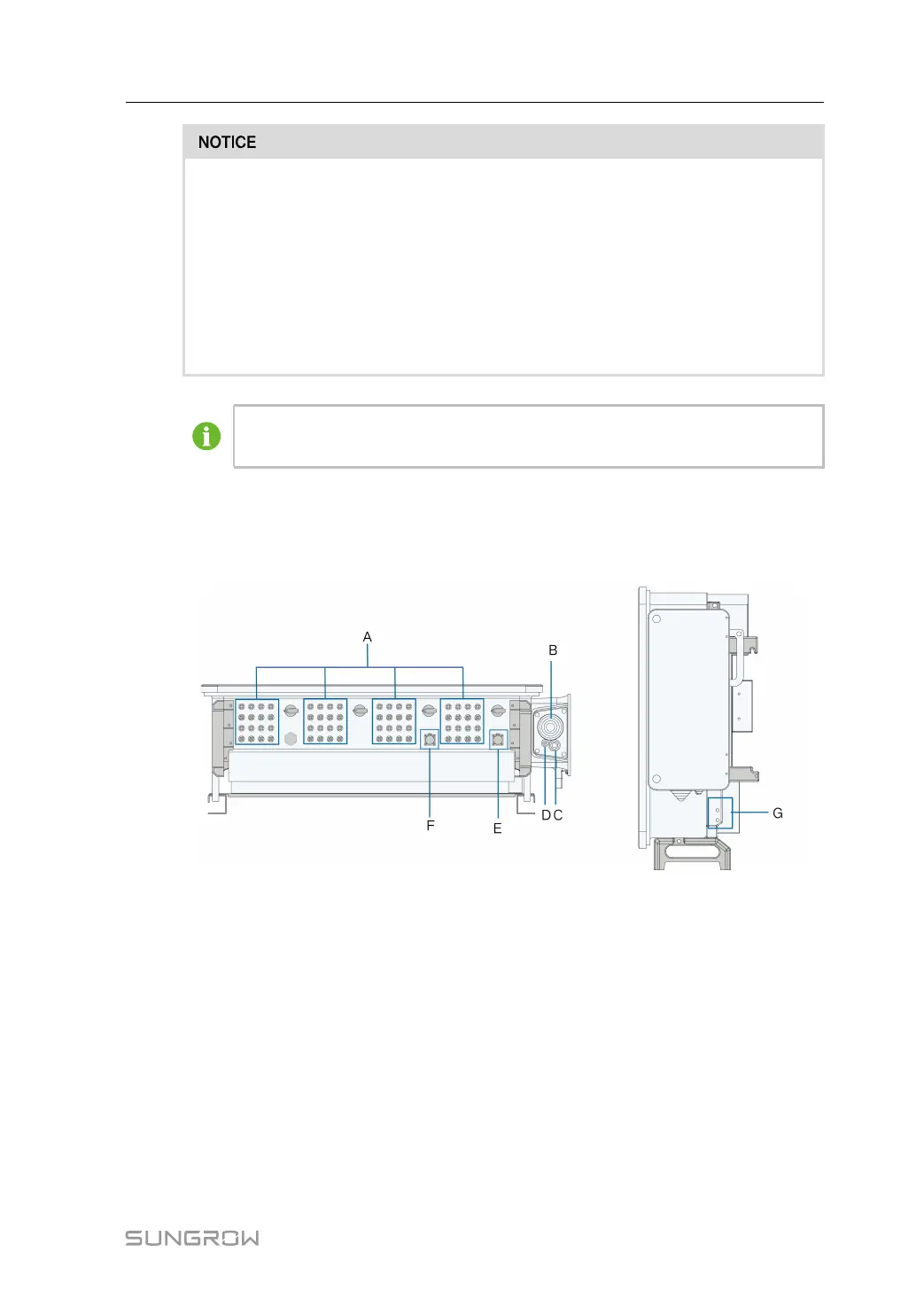 All electrical terminals are located at the side and bottom of the inverter.