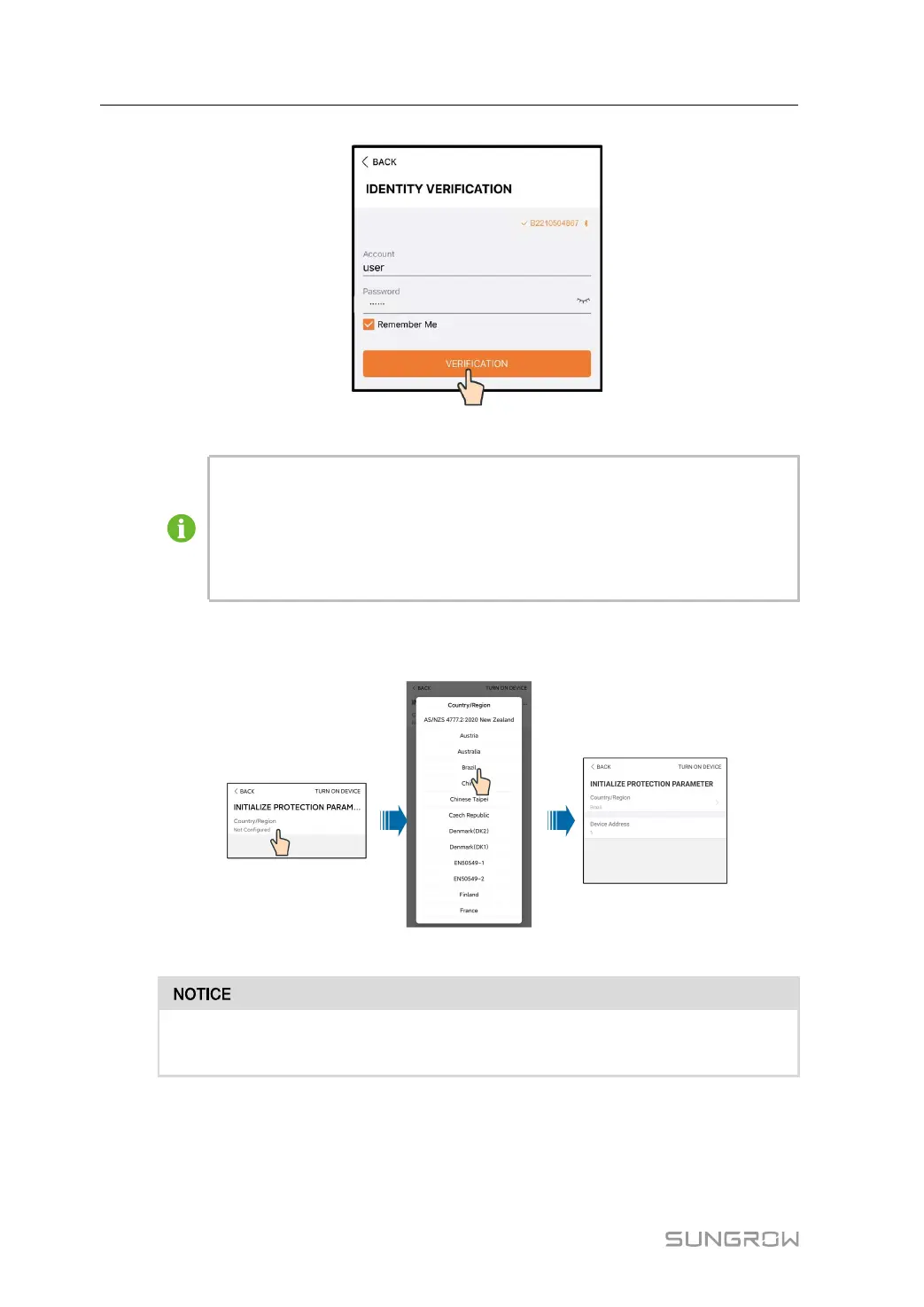 The Country/Region must be set to the country where the inverter is installed at.