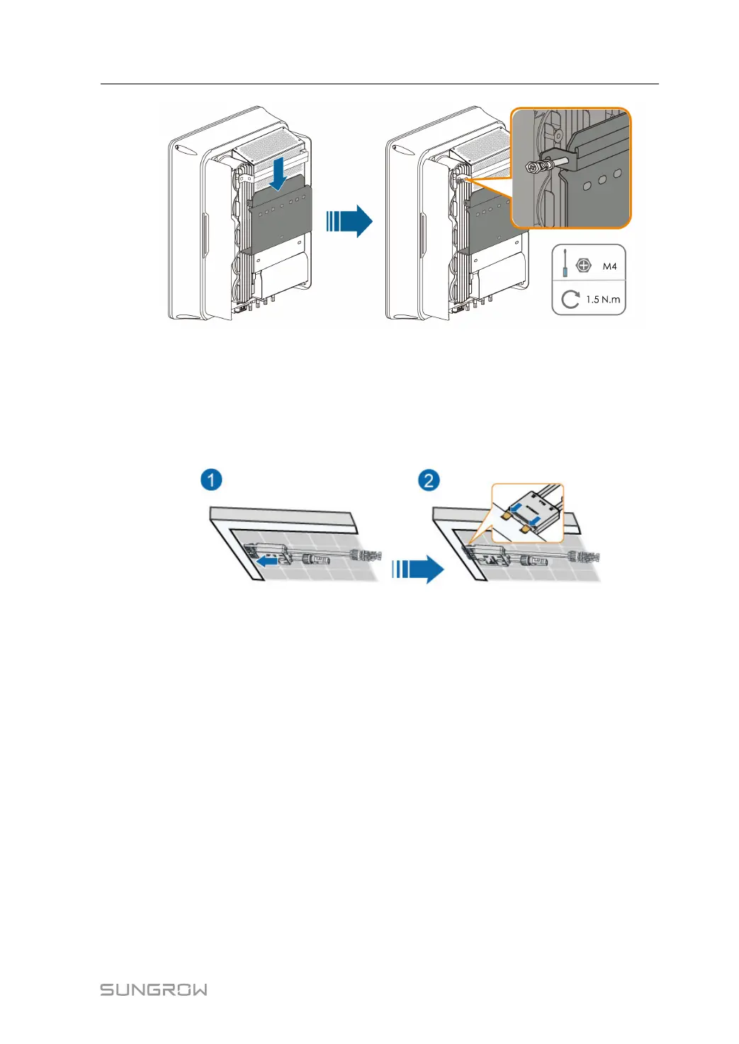 step 1 As shown in the figure below, clamp the optimizer parallel to the back of the PV module by