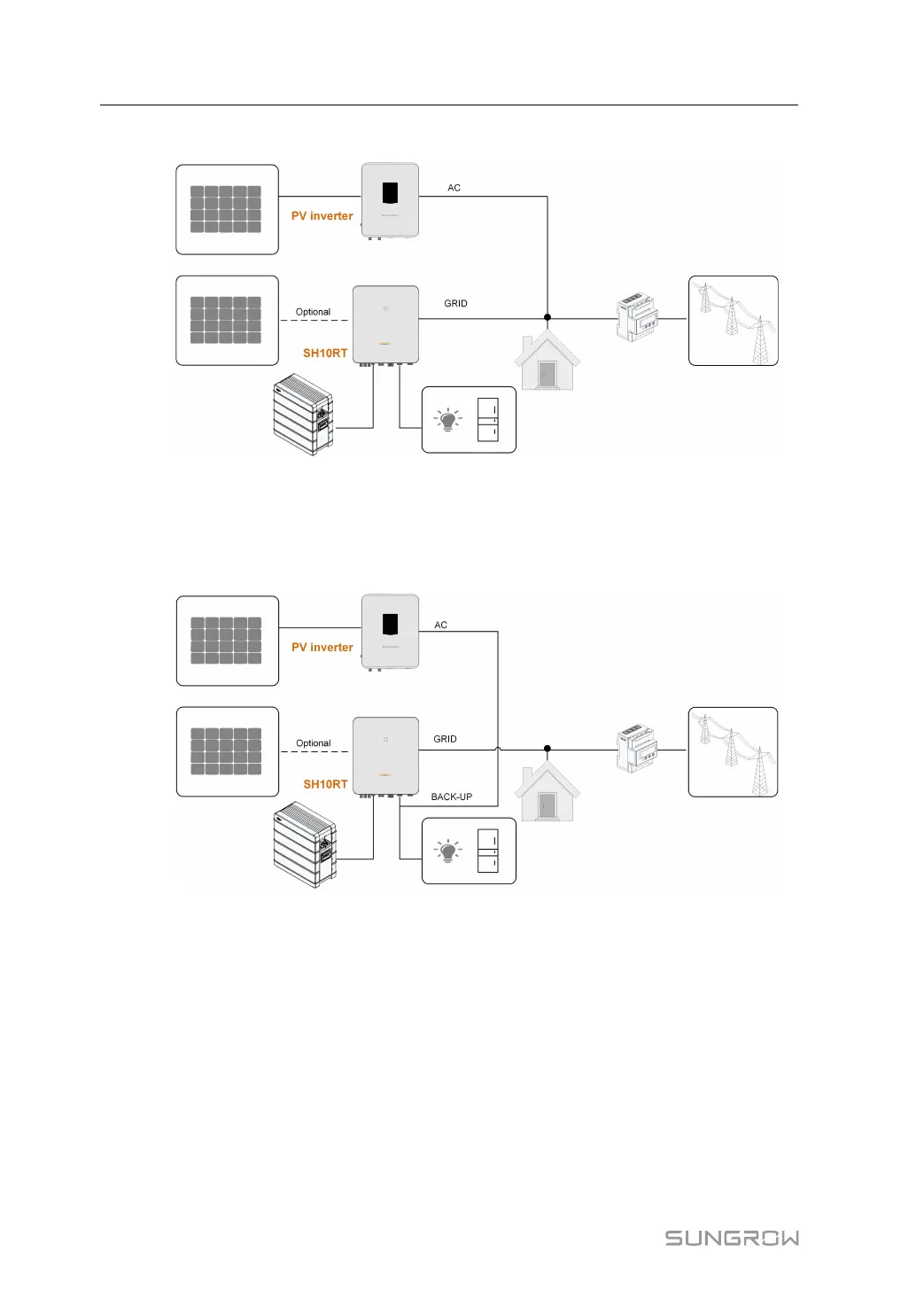 The AC terminal of the PV inverter and the BACK-UP terminal of the hybrid inverter are con-