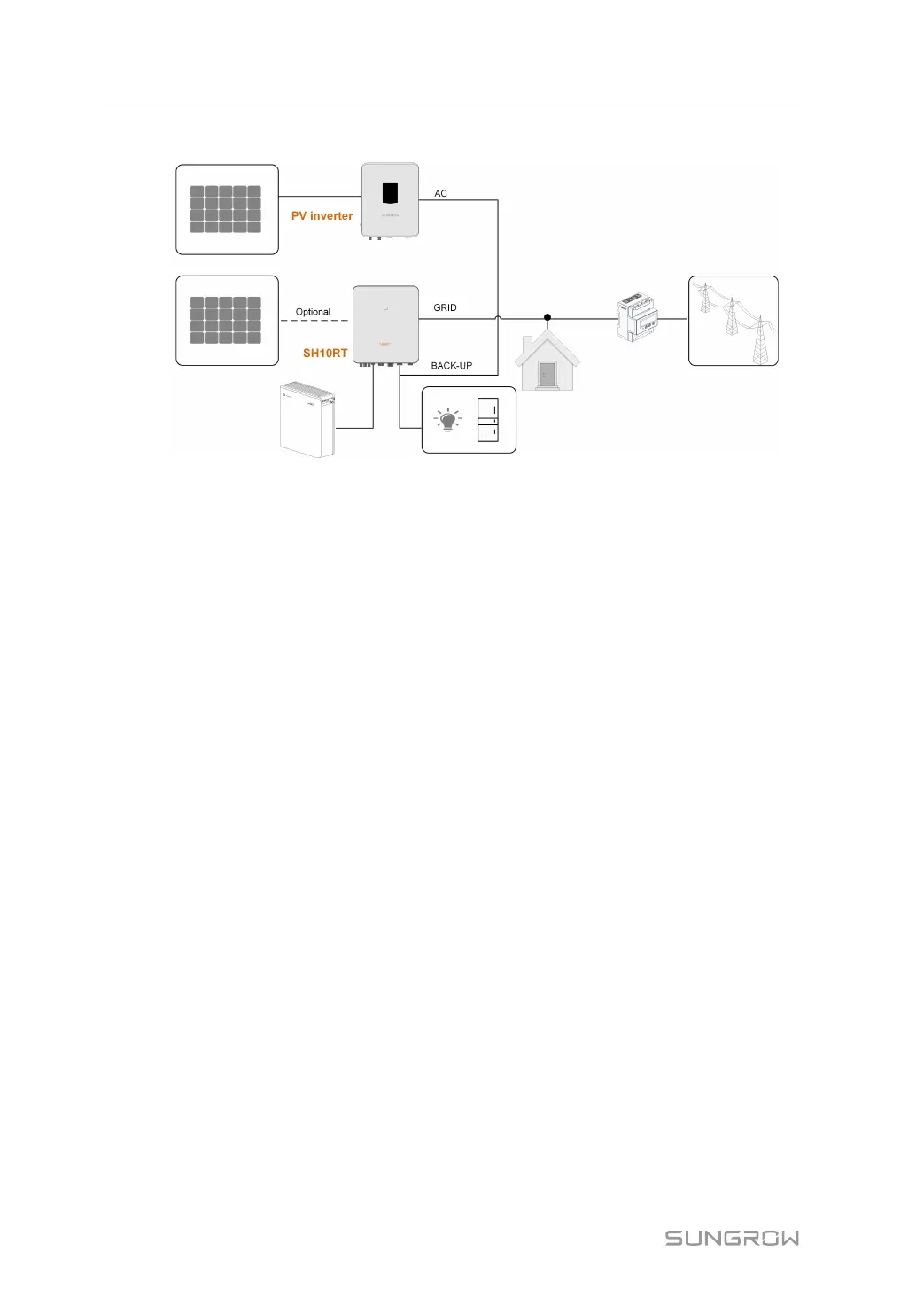 The AC terminal of the PV inverter and the BACK-UP terminal of the hybrid inverter are con-