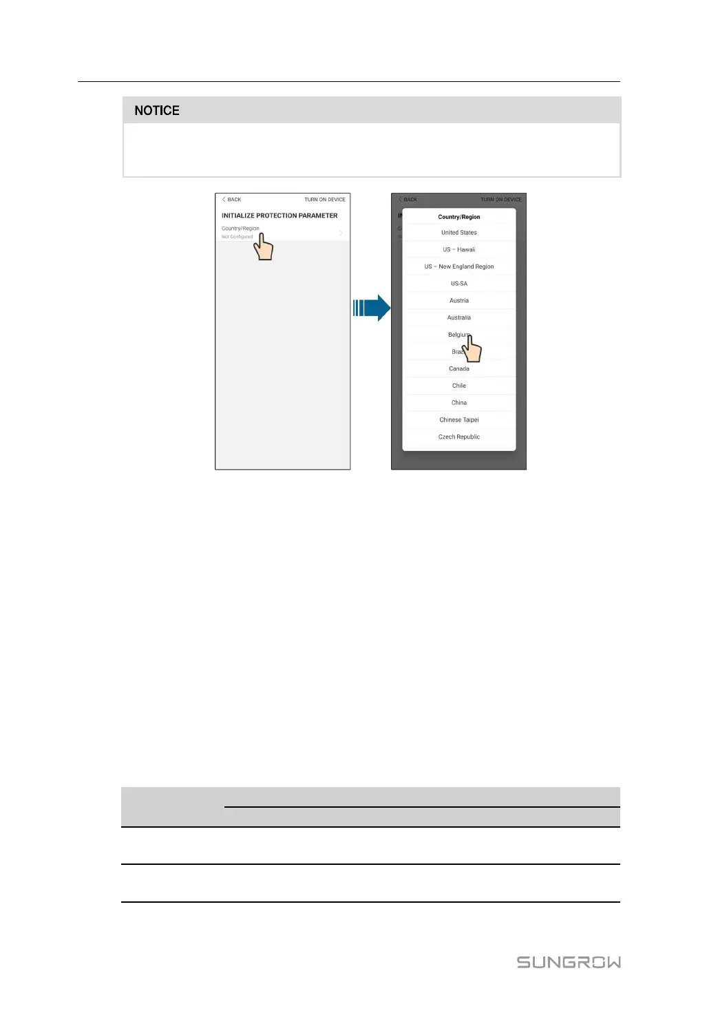 The "Country/Region" must be set to the country where the inverter is installed at.