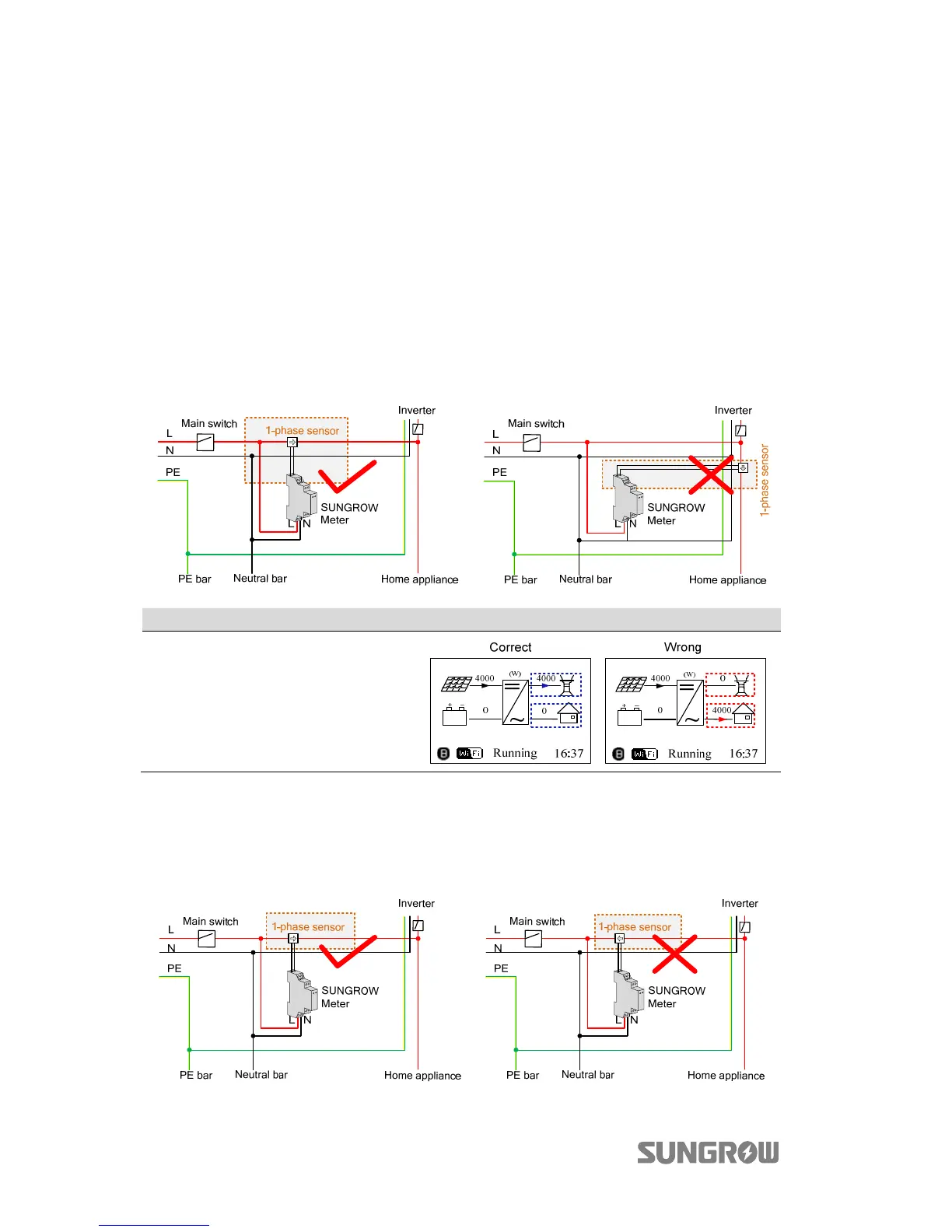 Make sure that the 1-phase sensor of the SUNGROW meter should be placed to the
