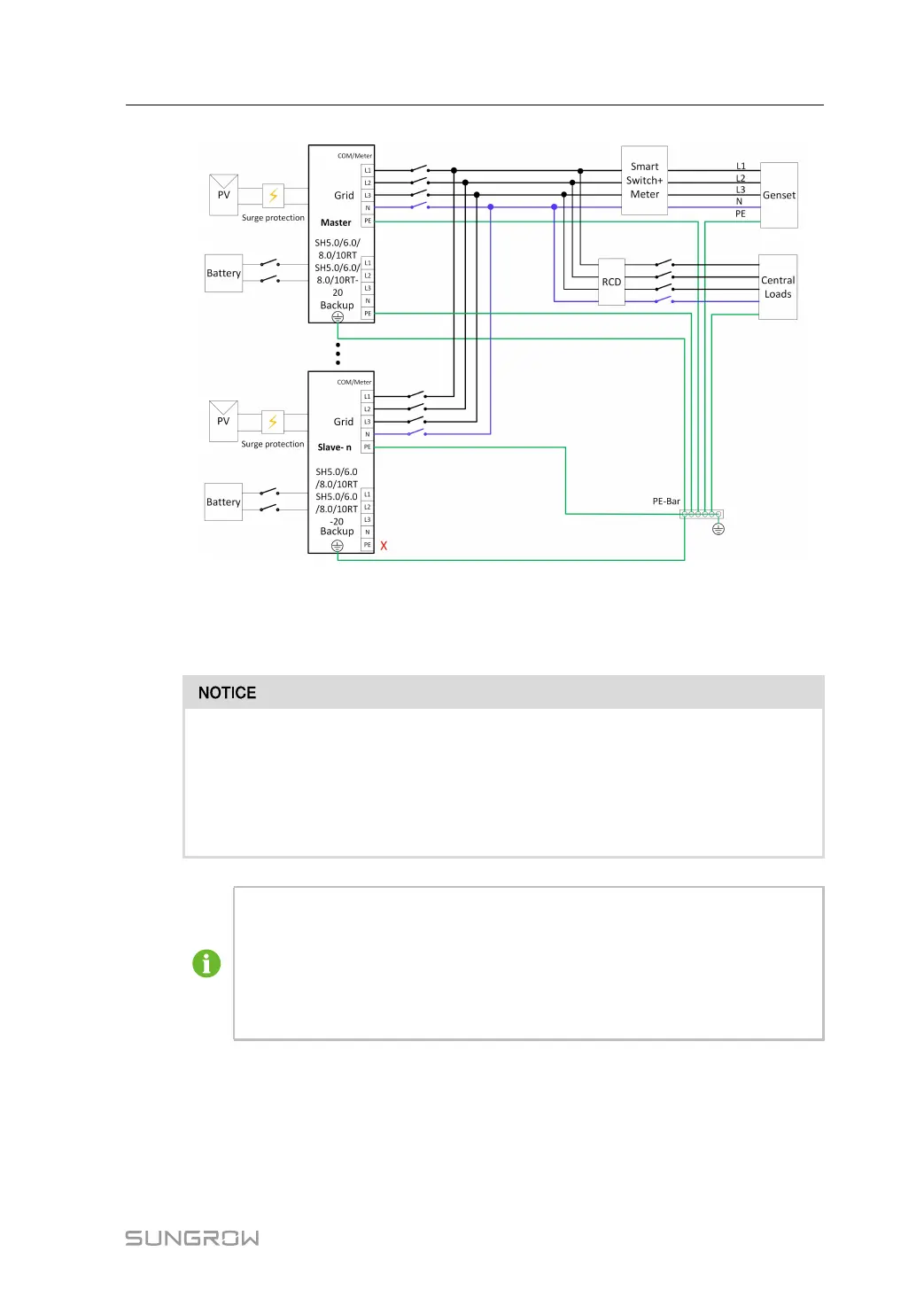 * Ensure that only the PE cable at the backup port of the master inverter is grounded in re-