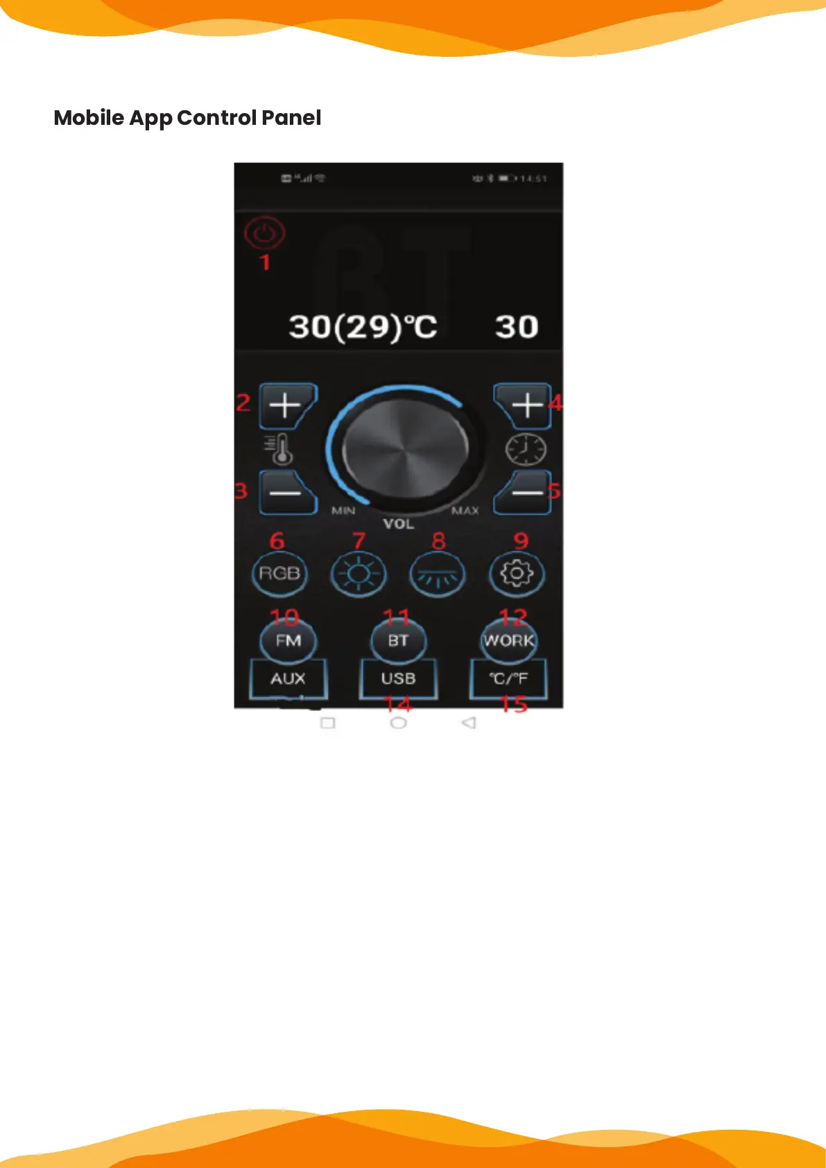 2.Temperature +/ Previous song/manual search: infrared mode is the temperature set-
