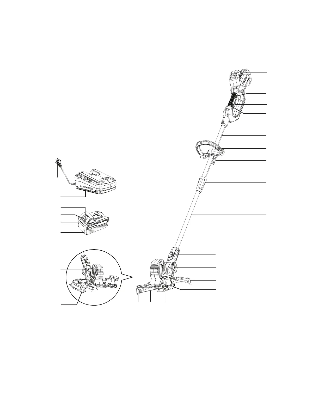 below to your cordless trimmer + edger in order to familiarize yourself with the location of the various controls and adjustments.