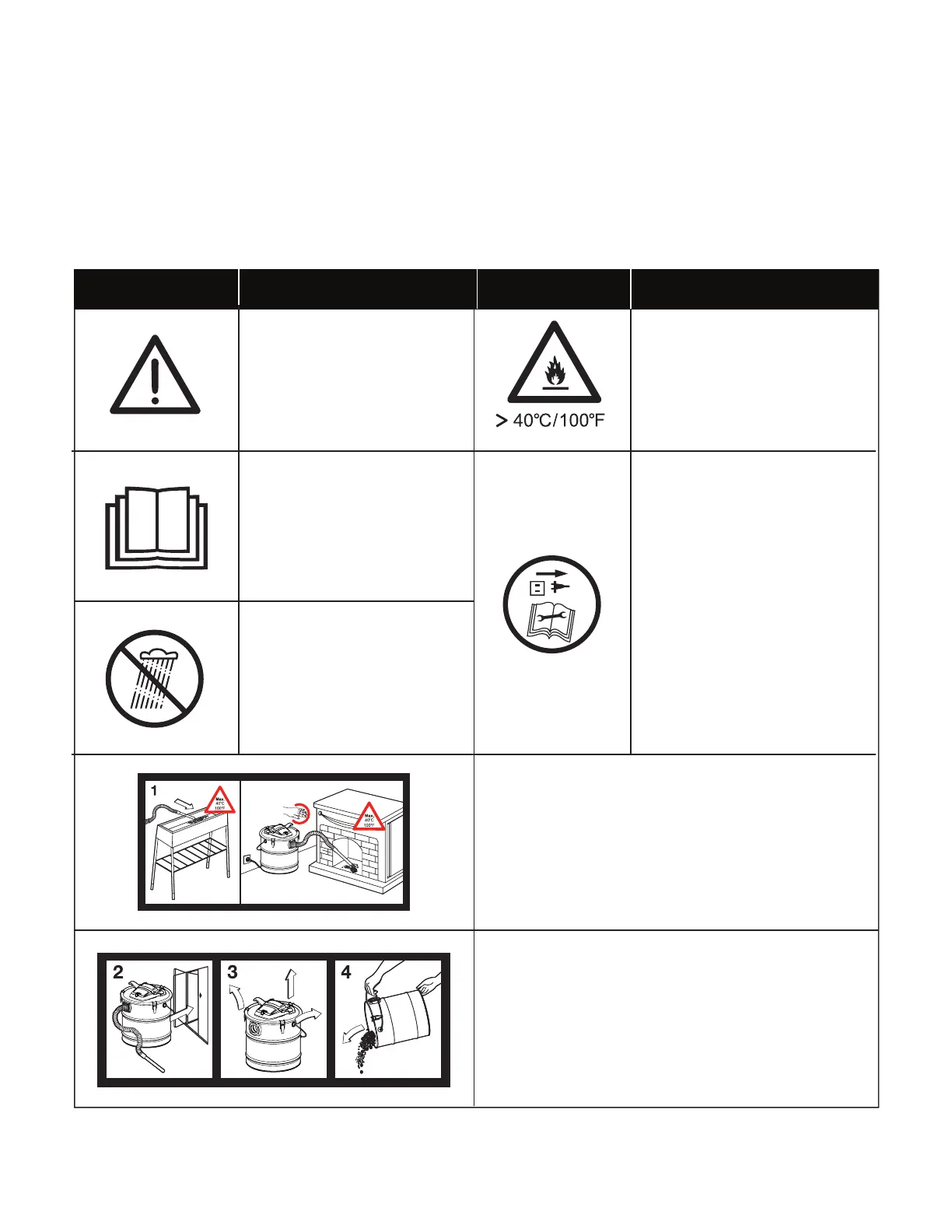 by sifting through the ashes with a metal implement before using the equipment. The cold ashes emit no further perceptible heat