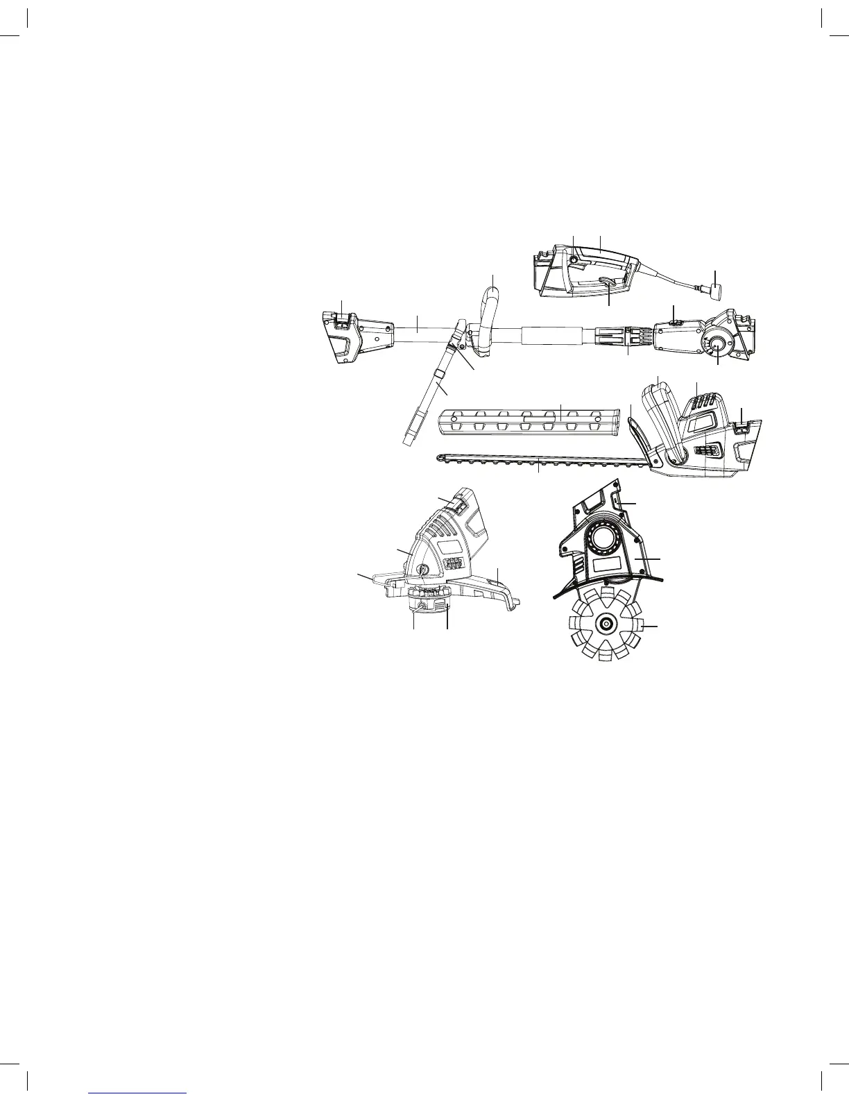 and garden tiller. Compare the illustration below to the power tool in order to become familiar with the location of the various