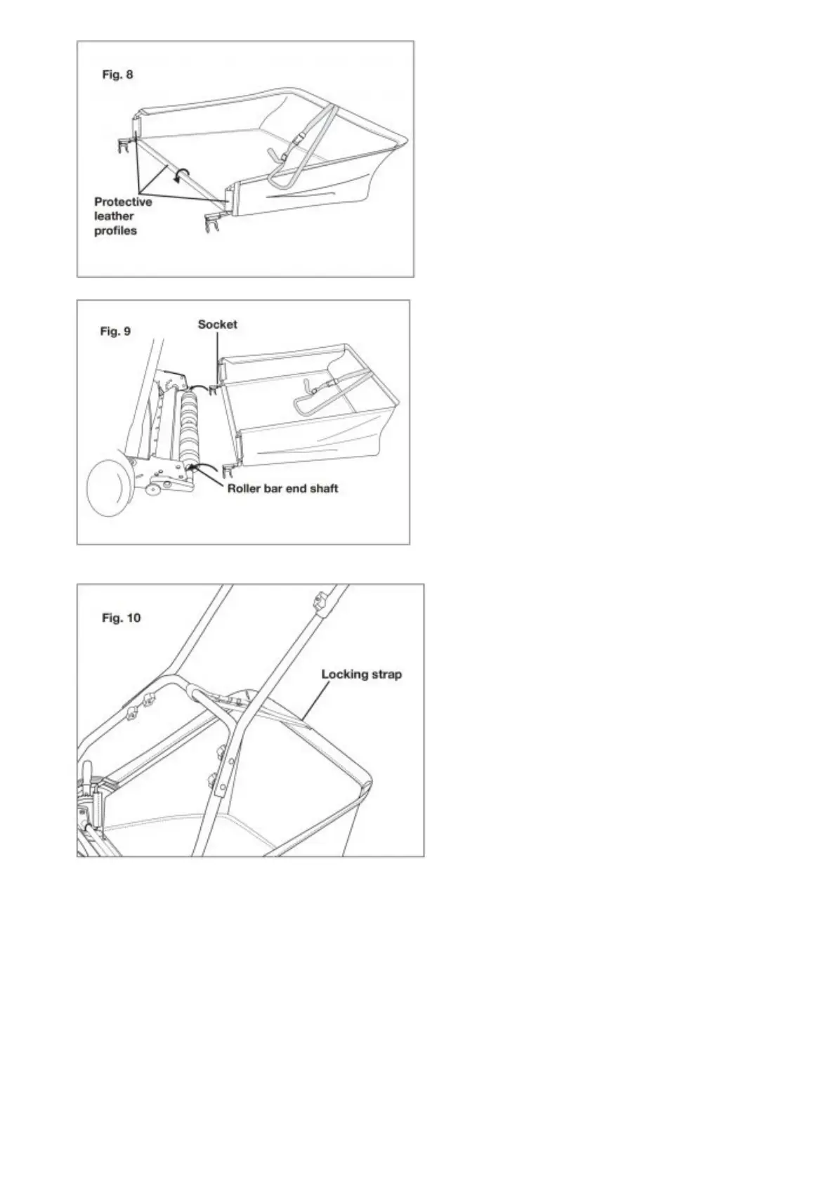 3. Hook the assembled grass catcher onto the mower by connecting the sockets to both ends of the roller bar end shaft (Fig. 9).