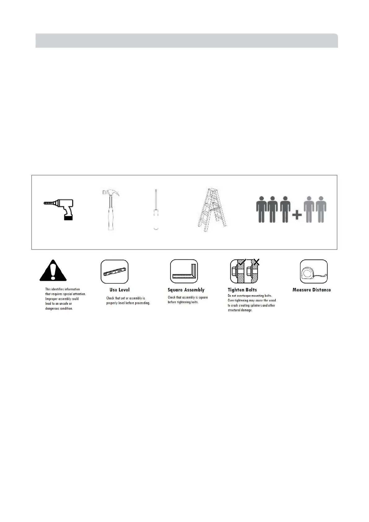 •When assembling wooden parts, do not overtorque the bolts to avoid splitting the wood.