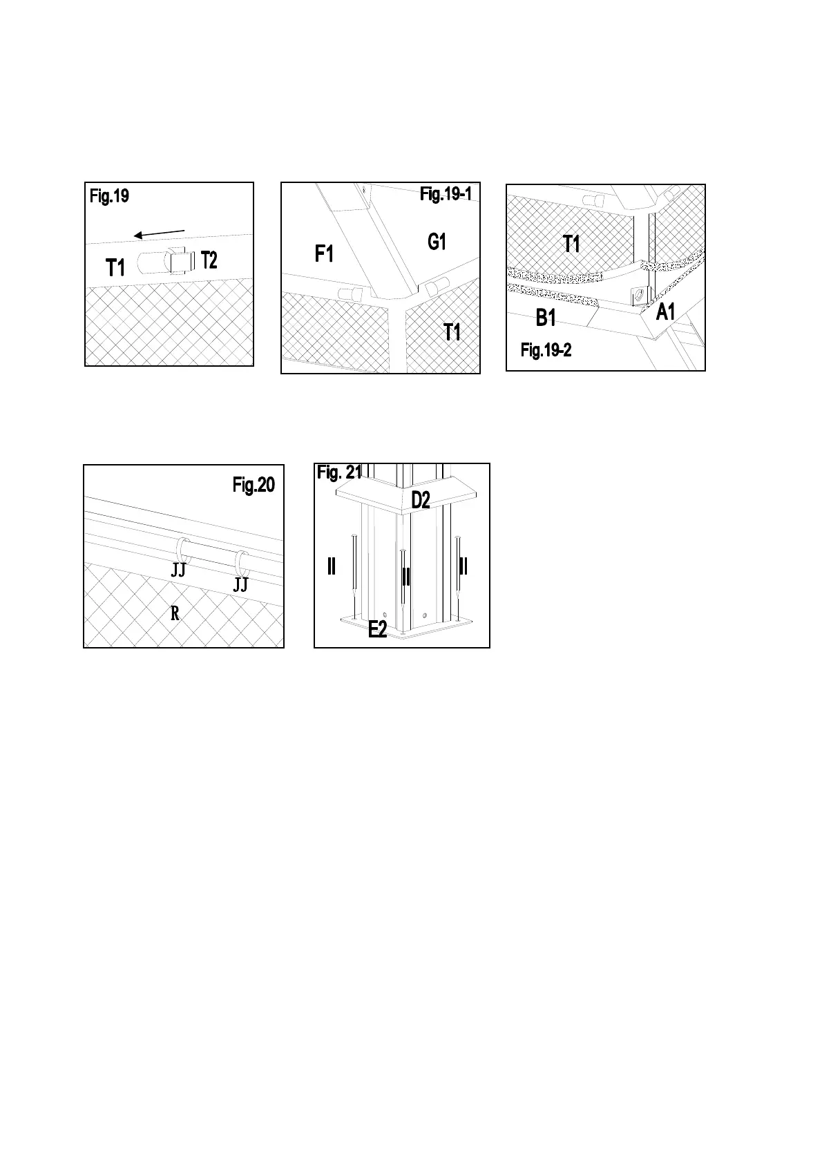 Fig.19-2 : Attach another velcro end of vented roof netting (T1) to the big top frame bar (A1 & B1).