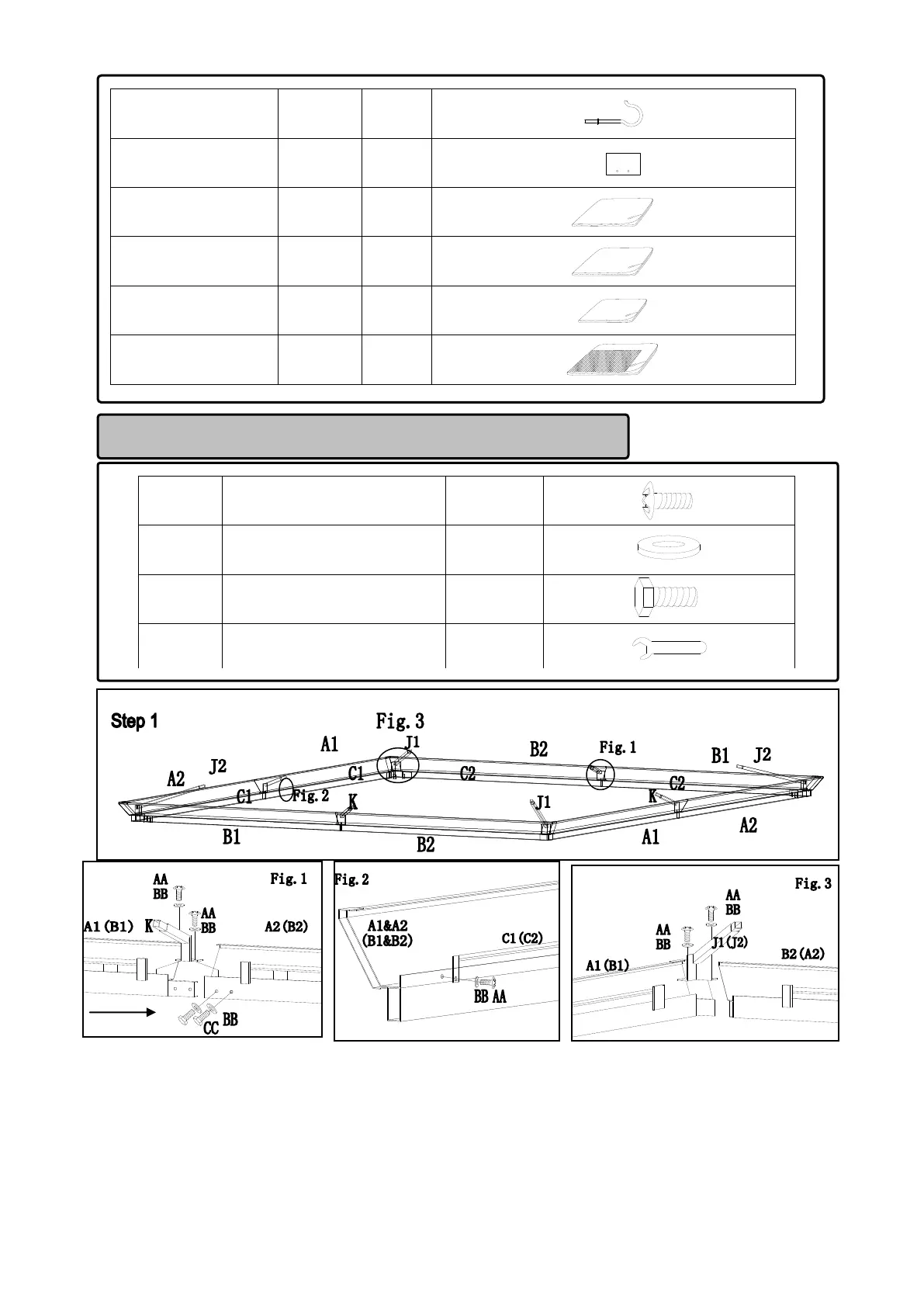 Fig.1: Introduisez les Poutres A1 (B1) dans les Poutres A2 (B2), et fixez-les avec Boulon (CC) et Rondelle
