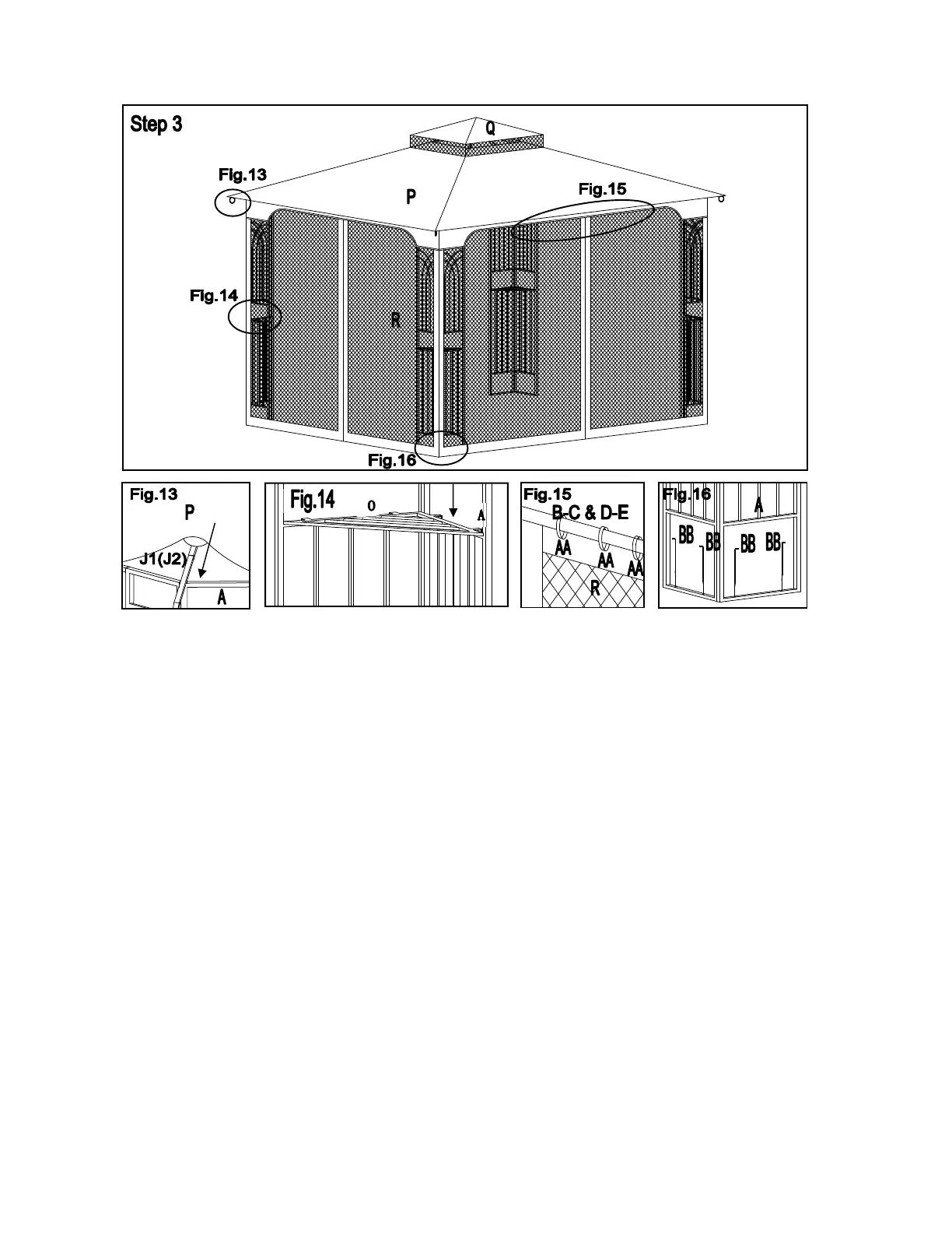 Fig.16: Secure the assembled gazebo to the ground with the provided stakes (BB) through the bottom of