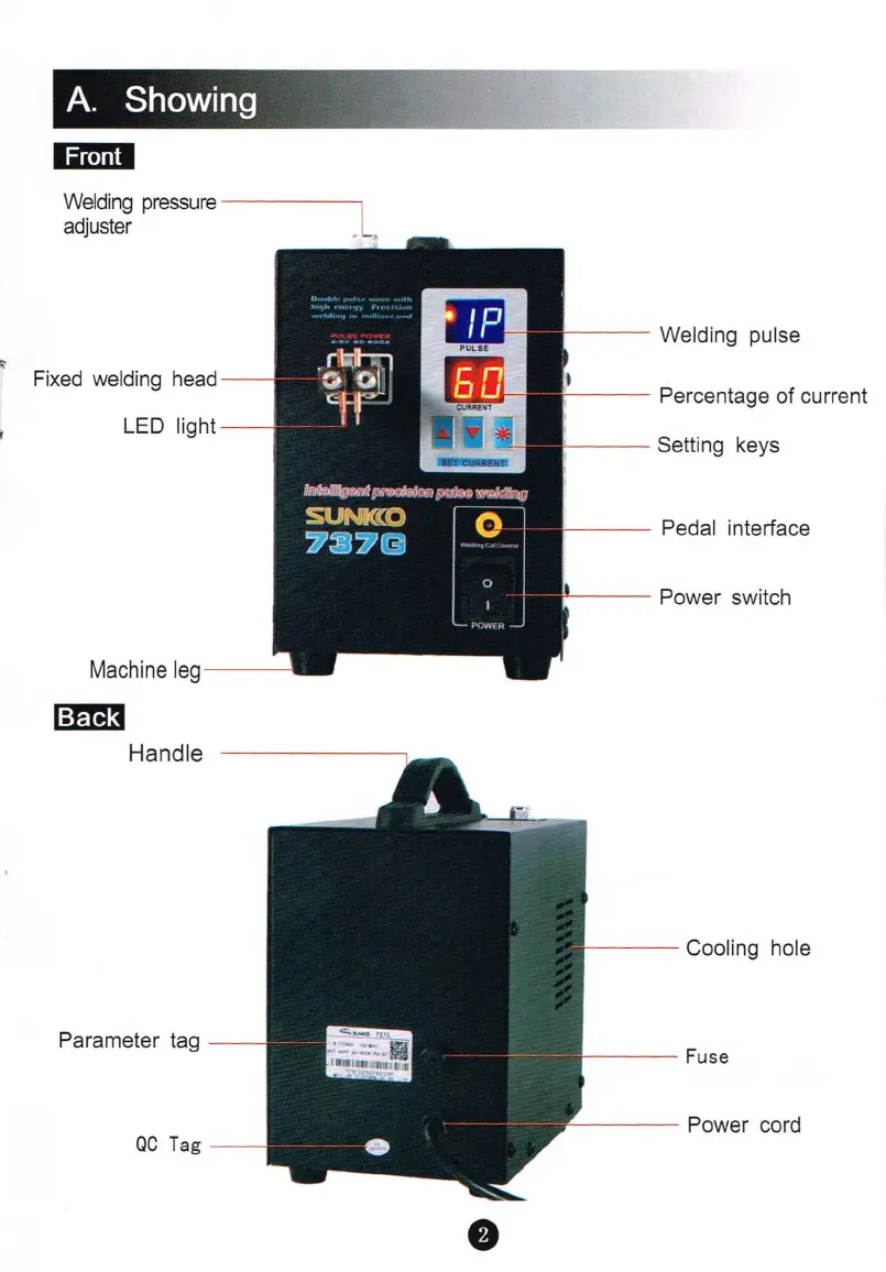 Sunkko 737G - Showing Product Components; Front View Details; Back View Details