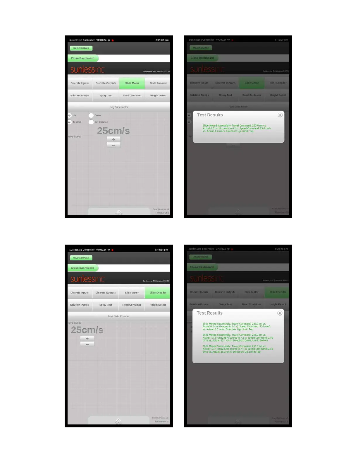 Slide Motor Test Screen Slide Motor Results Screen